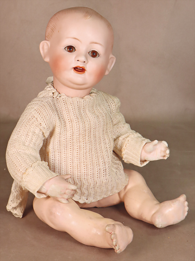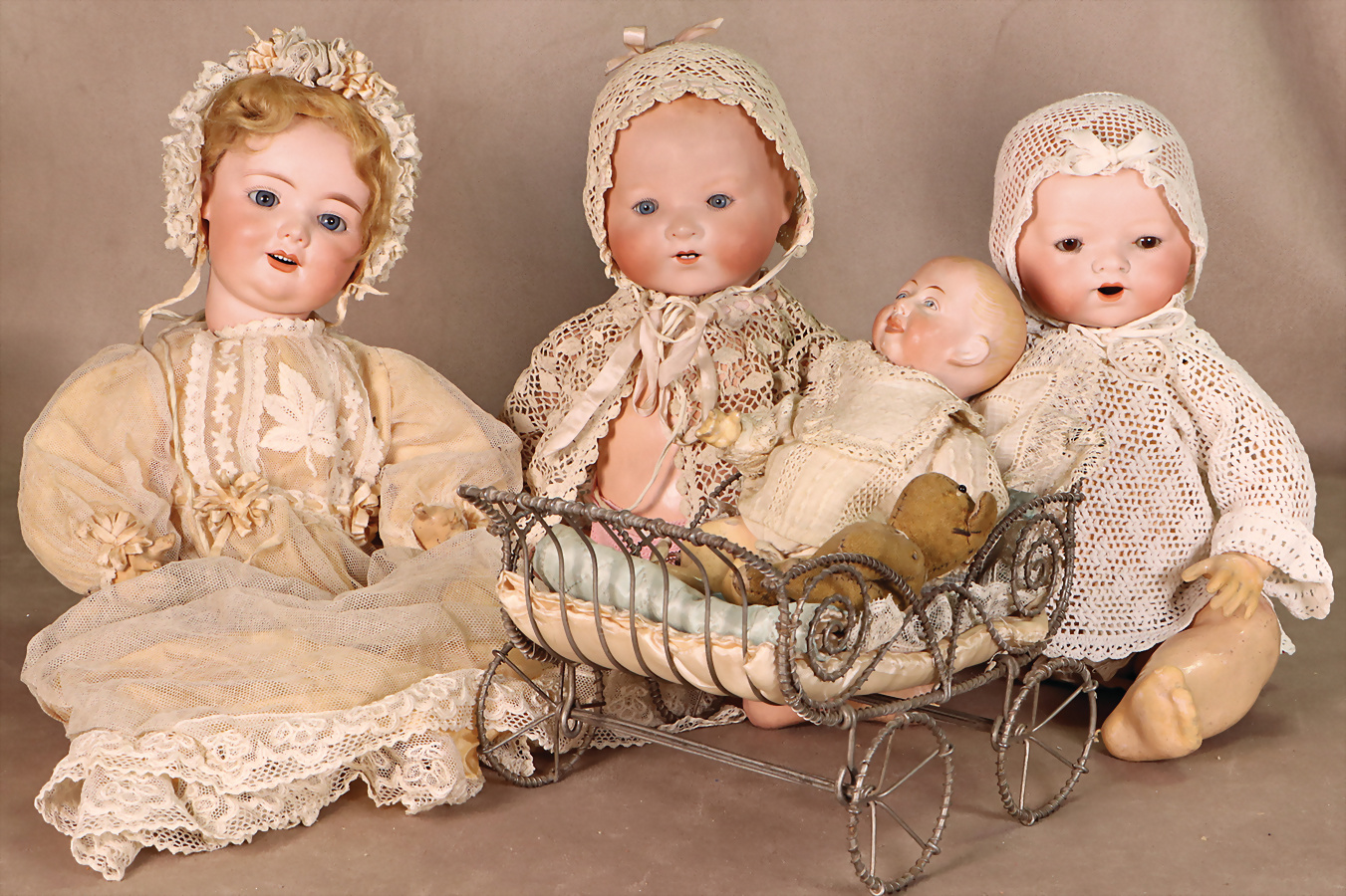 Konv. Puppen, KÄMMER & REINHARDT, 126, 37 cm, braune Schelmenaugen, off. Mund, Sitzbaby-Körper, Echthaar-Perücke, Keramik-Kopf-Puppe, Wachstuchkörper, Celluloid-Arme u. -Beine, dazu passend?, ARMAND MARSEILLE, 352, Einbindekopf-Baby, Vollkopf, Schlafaugen, off. Mund, Stoffkörper, Masse-Hände, 25 cm, bitte Transportrisiko für die Augen bewachten, wohl HERTEL, SCHWAB & CO, Charakter-Baby, 36 cm, Vollkopf, gemalte Augen, off./geschl. Mund, Körper übermalt, 1 Finger weggebrochen, Papiermaché-Puppe, Filzkörper, „Spielzeugmuseum Graz“