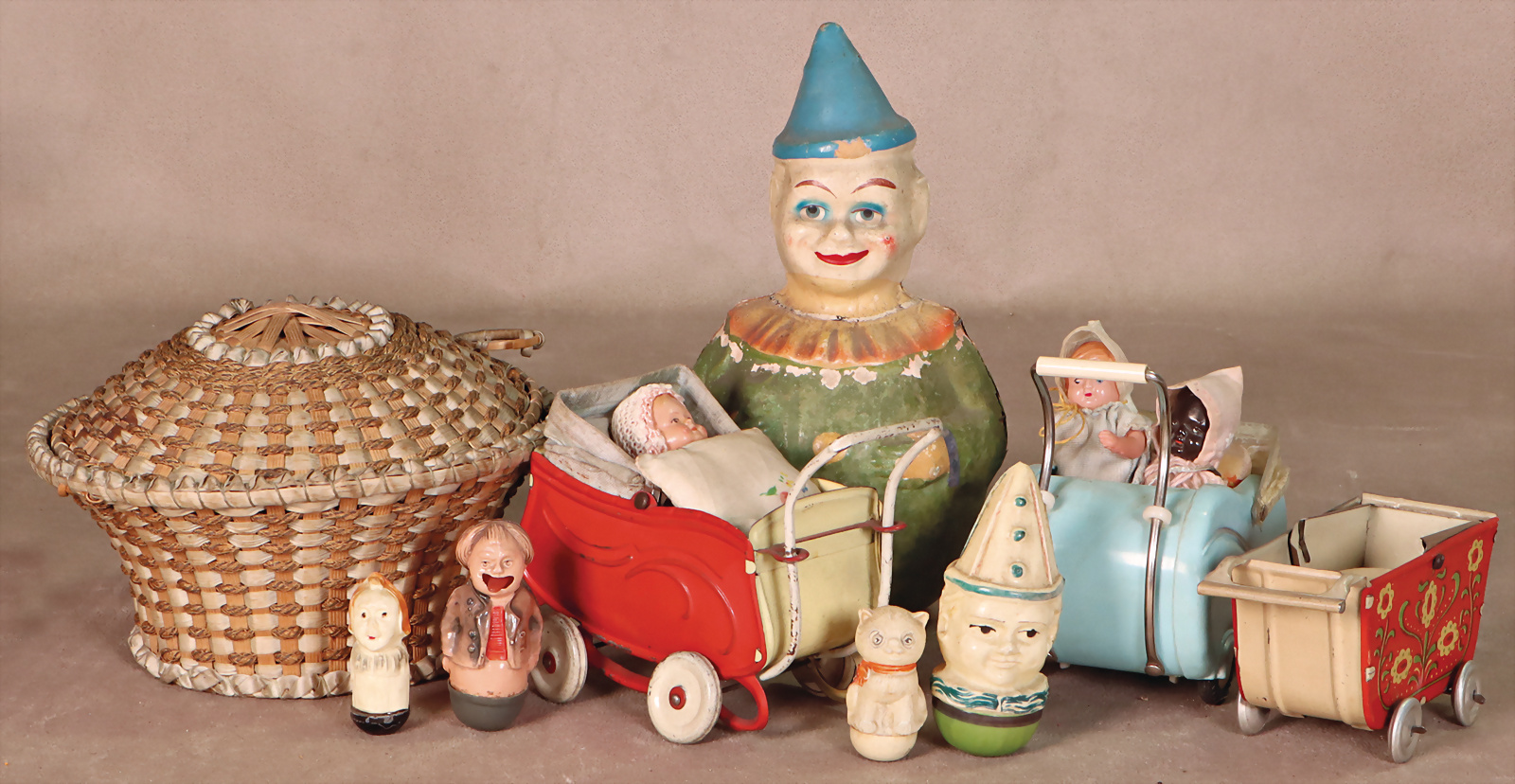 RollyPolly, Clown, Papiermaché, 5 cm, Masse-Abplatzer an der Naht, kl. Celluloid-Puppe, Korb, 2 Kinderwägen, Celluloid-Stehauffiguren, kl. Kinderwagen, „Spielzeugmuseum Graz“