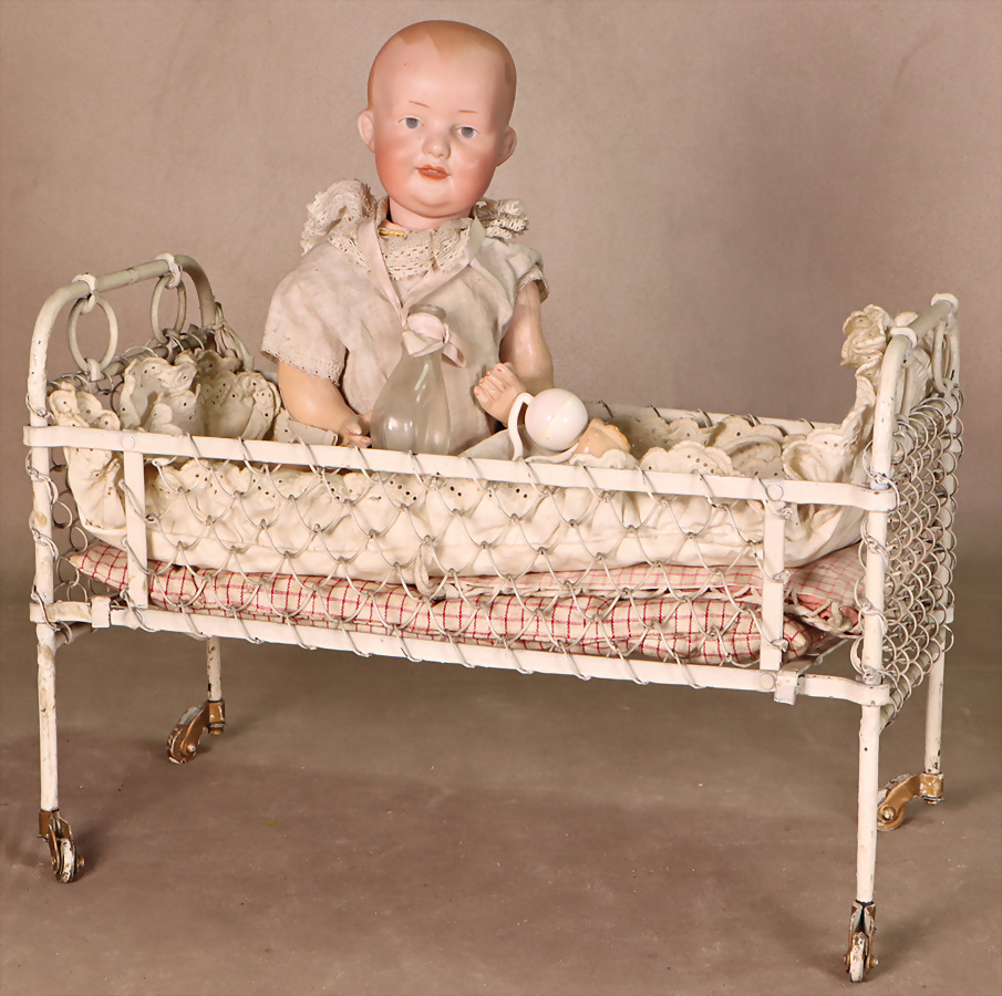 Puppenbett, schmiedeeisern, mit Porzellan-Charakter-Baby, ARMAND MARSEILLE, 560, 26 cm, Sitzbaby-Körper, „Spielzeugmuseum Graz“