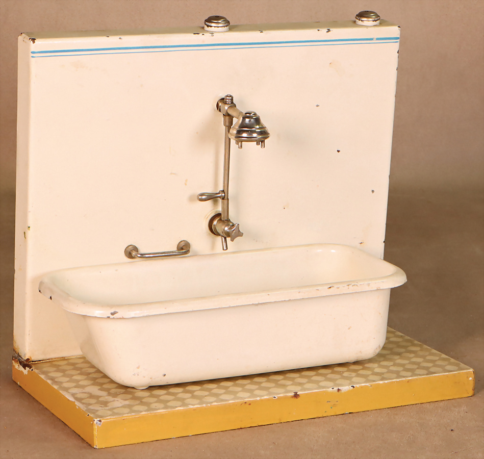 Badewanne, Blech, H: 19,5 cm, mit Wasserbehälter, Rückwand 1x nachgelötet, „Spielzeugmuseum Graz“