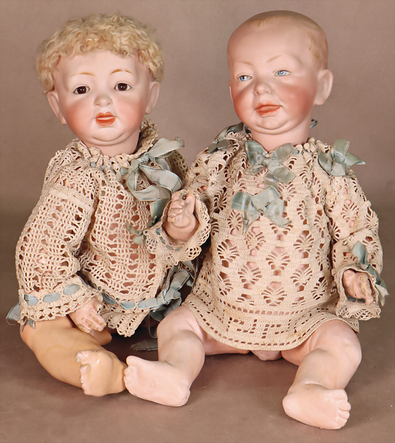 Max&Moritz, schön gemachtes Replika, 21 cm, Porzellan-Köpfe, Glasaugen, geschl. Melonenmund, Masse-Stehkörper, Porzellan-Brustblattkopf (Vollkopf auf Stab), mit Quietschstimme (defekt), fest einges. Glasaugen, geschl. Mund, ARMAND MARSEILLE, 985, 28 cm, ARMAND MARSEILLE, 1894, 21 cm, Masse-Stehkörper, „Spielzeugmuseum Graz“