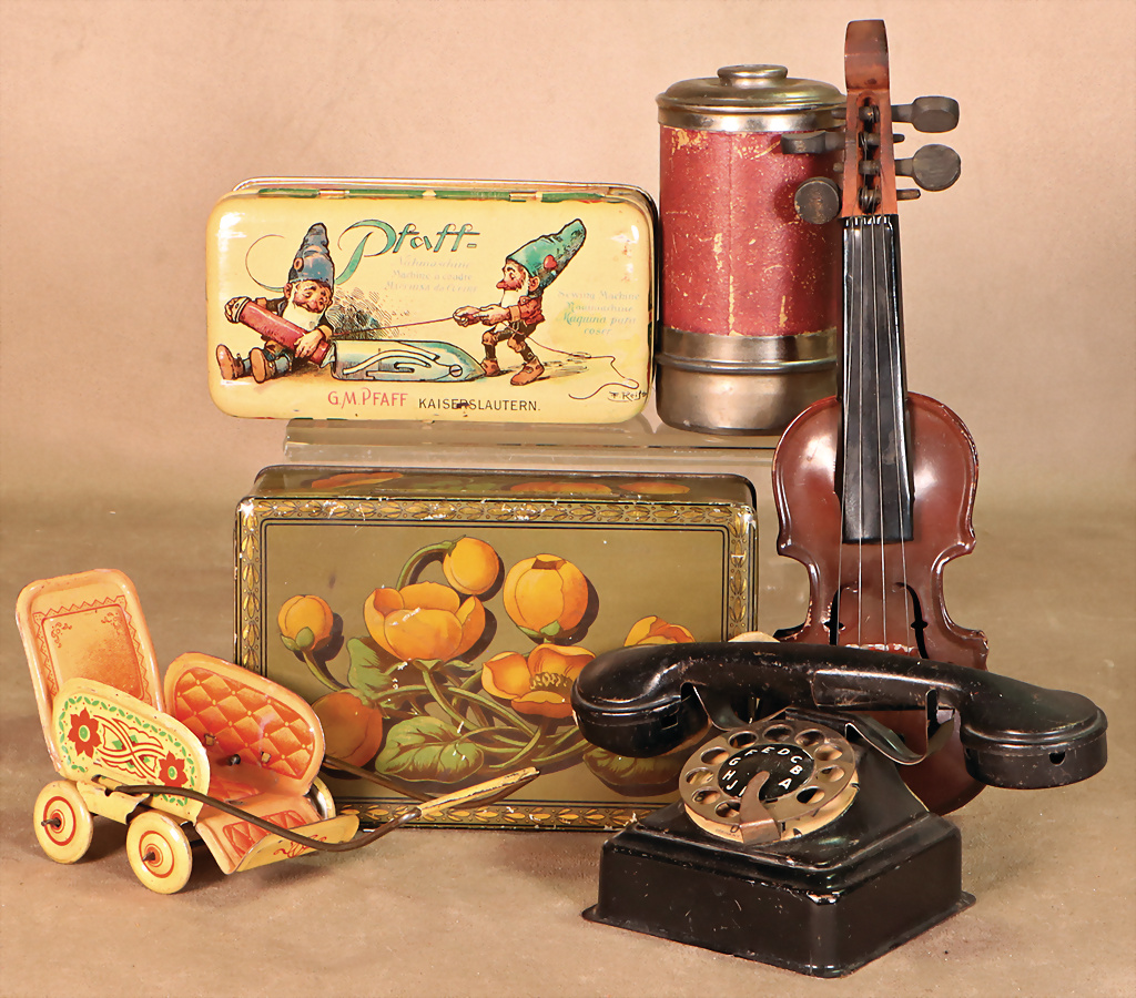 Konv. Kaleidoskop, Geige, Telefon, Puppenstuben-Kinderwagen, Dose mit Zwergenmotiv, Blechdose, Blumendekor, „Spielzeugmuseum Graz“