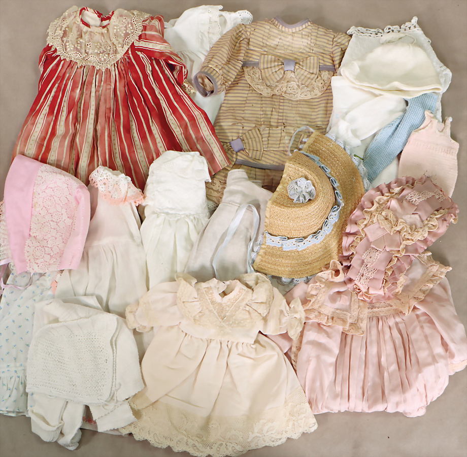 Puppenkleidung, teils alt, teils aus alten Stoffen genäht, 1 Perücke neuer, einige Strickteile, neuer, bitte besichtigen