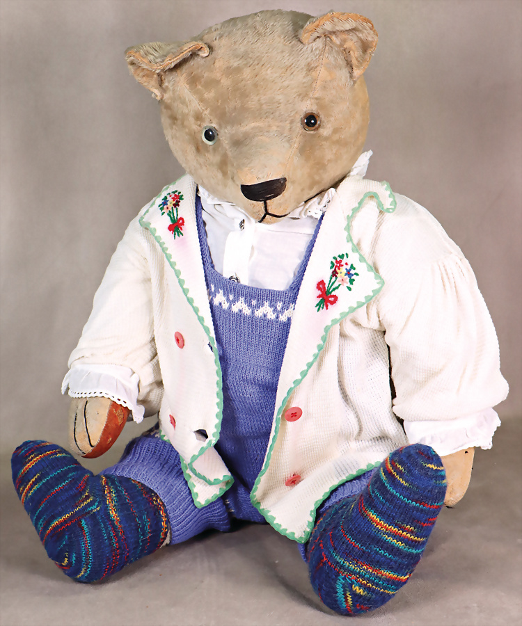 Bär, wohl SONNEBERG, 78 cm, Mohair-Plüsch, Glasaugen, Filztatzen, teilw. abgeliebt, außergewöhnliche Gr.