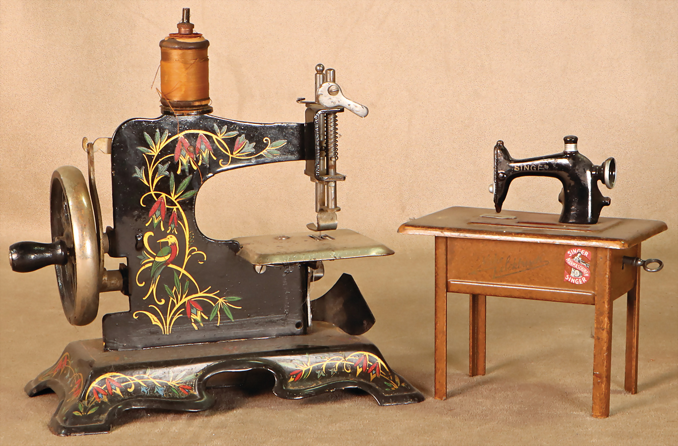 2 Teile, Nähmaschinen, SINGER (Spardose), H: 13 cm, Kindernähmaschine, Blumendekor, H: 19,5 cm, „Spielzeugmuseum Graz“
