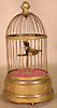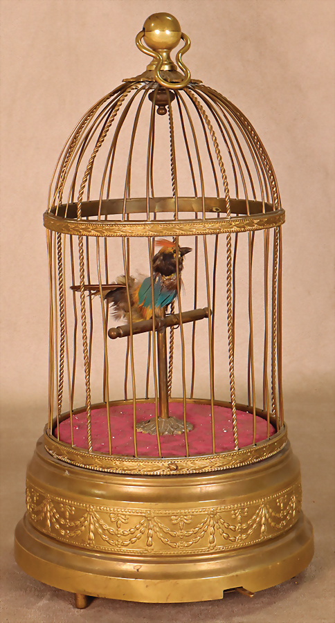 Vogelkäfig, mit Vogel, Messingblech, Uhrwerk intakt, Stimmer defekt, H: 31 cm, „Spielzeugmuseum Graz“