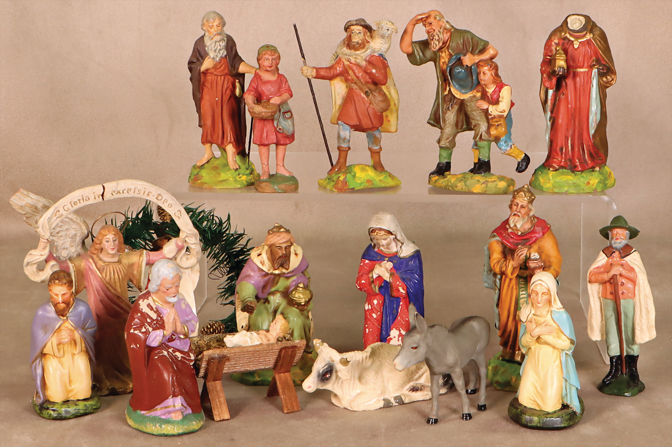 Krippenfiguren, teils Holz, teils Masse, untersch. Größen, guter Zustand - Fehlstellen, „Spielzeugmuseum Graz“