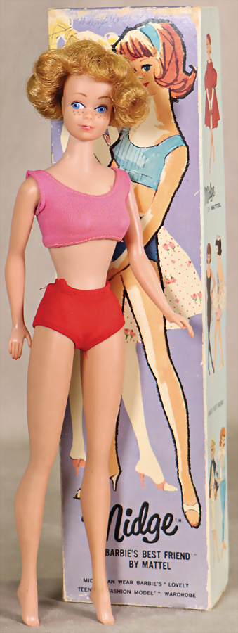 Barbie, Midge, guter Zust., im Orig.-Kart., Kart., etwas verschlissen, mit Ständer