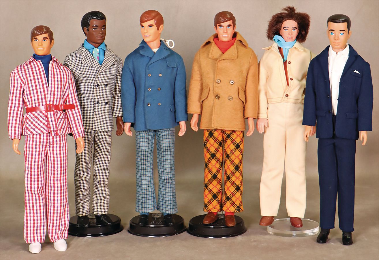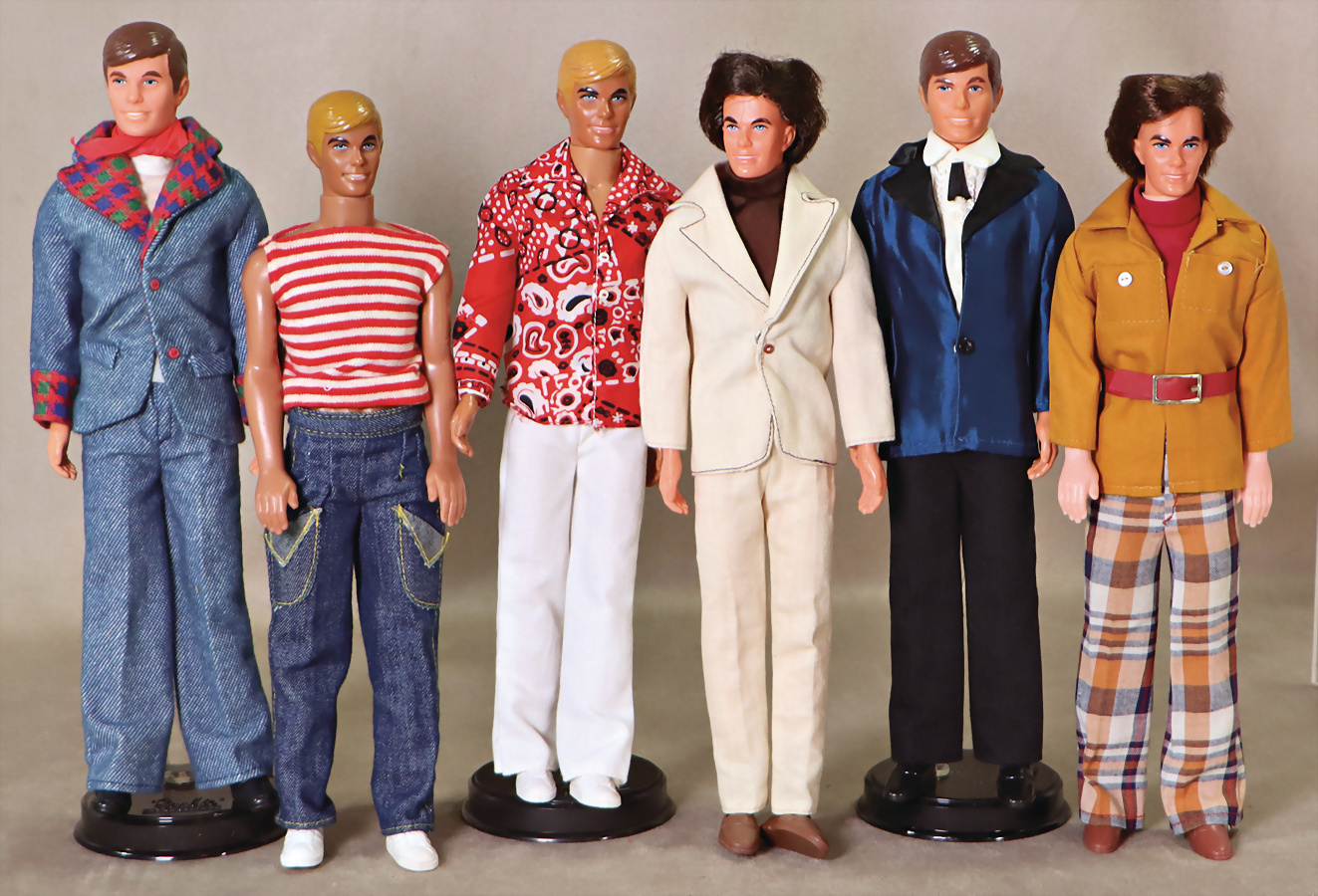 Barbie, 6 Teile, Talking Brand, 1970, mit Outfit 1434, Talking Ken, Outfit 1473, 1970, Ken, 1964, Outfit 1401, Ken, 1972, Outfit 9167, New York Ken, 1975, Ken, 1970, Outfit 1449