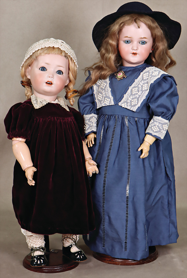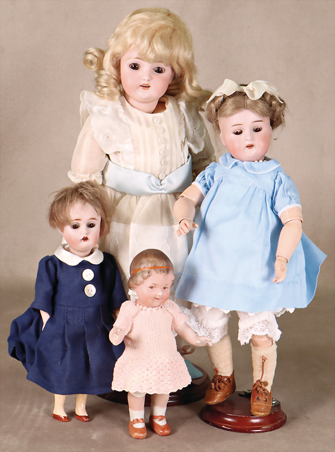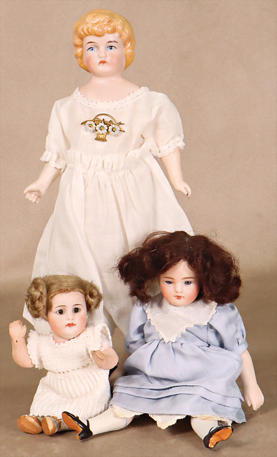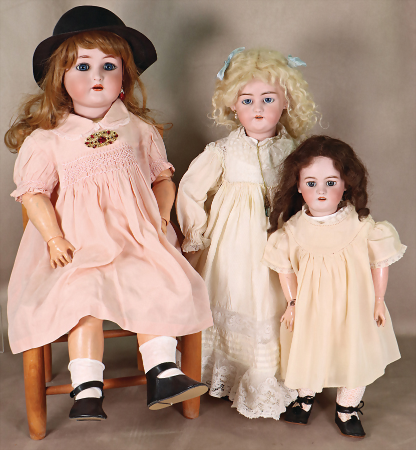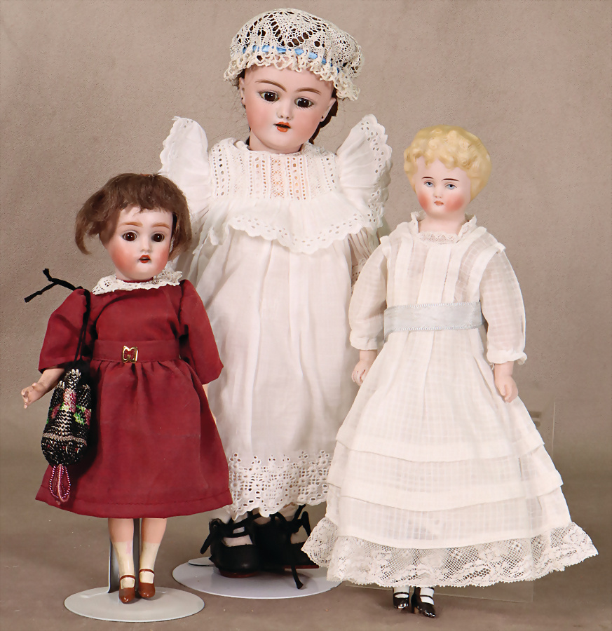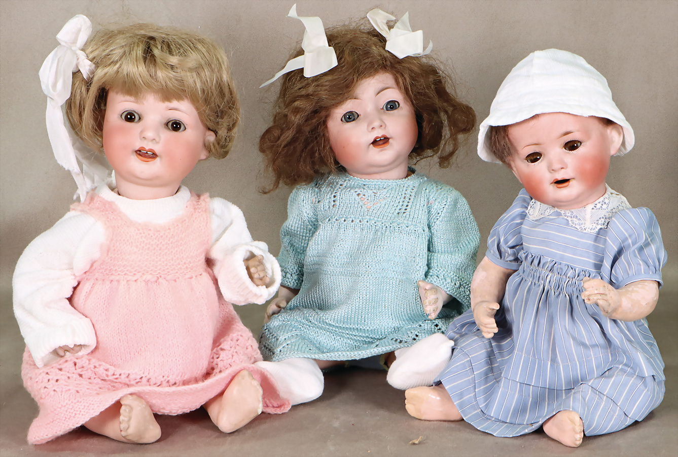 Konv. 3 Puppen KÄMMER & REINHARDT / SIMON & HALBIG, 76 cm, blaue Schlafaugen, offener Mund oben Zähne, Lippen nachgezogen, durchstochene Ohren, ein deutlicher Abplatzer an einem Ohr, Kopfdeckel wurde fest verklebt, konnte nicht gelöst werden, Puppen wurde nicht ausgeleuchtet, stärker bespielter Gliederkörper, SIMON & HALBIG, 1078, Riss auf der Stirn, 50 cm, Kurbelkopf, blaue Schlafaugen, offener Mund, Zähne, Kinngrübchen, durchstochene Ohren, SIMON & HALBIG, 1079 DEP 11½, Ҥ 59 cm blaue Schlafaugen, offener Mund oben Zähne, durchstochene Ohren, Chip am Augenlid, Kleberreste am Kopfrand, Gliederköper, Perücken neuer