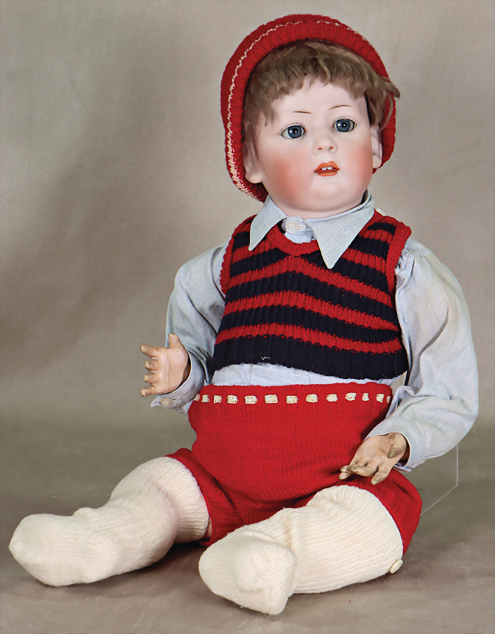 1070 Porzellan-Charakter-Puppe, 46 cm Kurbelkopf blaue Schlafaugen, offener Mund oben Zähne, berwegliche Handgelenke Gummis locker