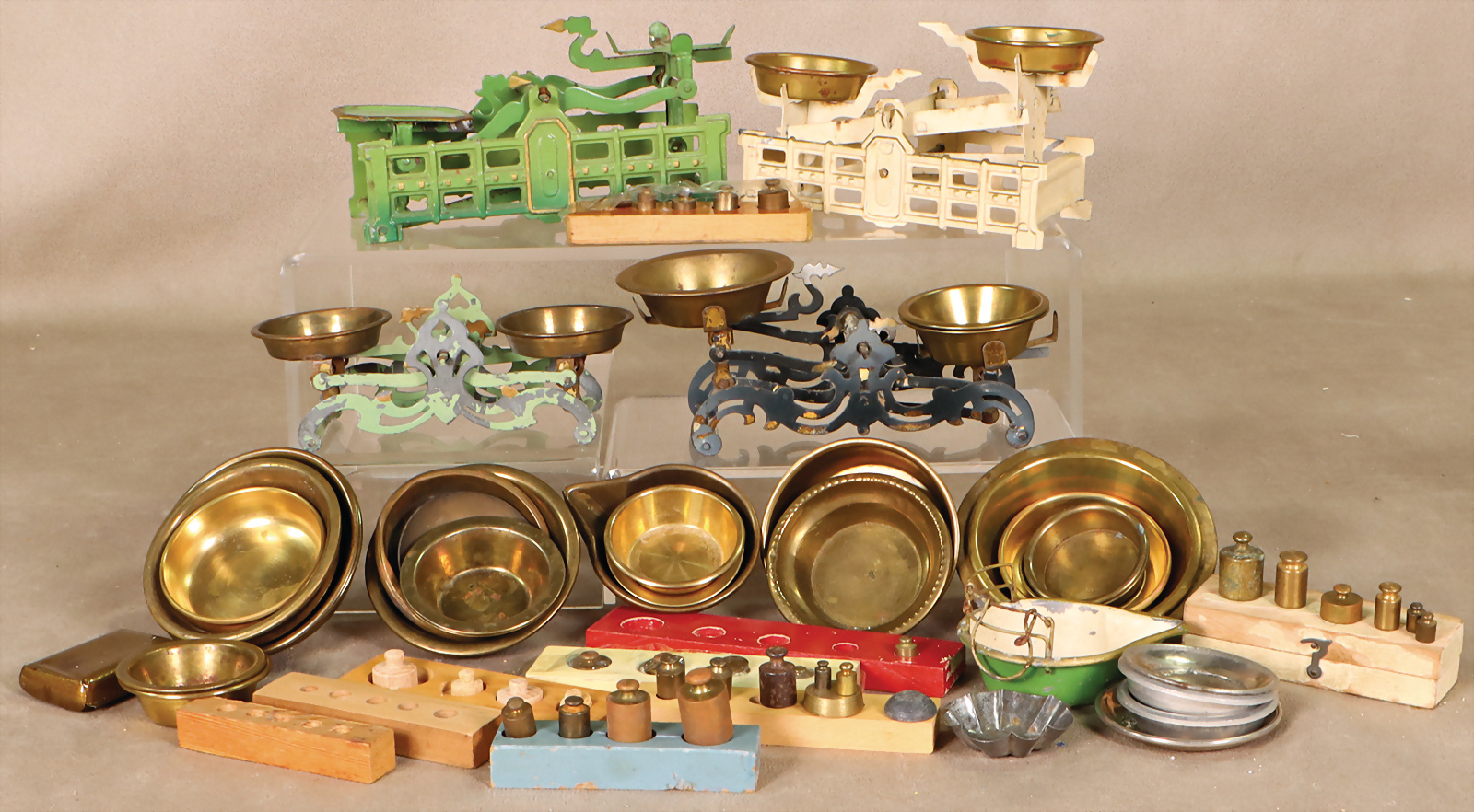 Teller, Waagen in unterschiedlichen Größen mit Gewichten, bitte besichtigen