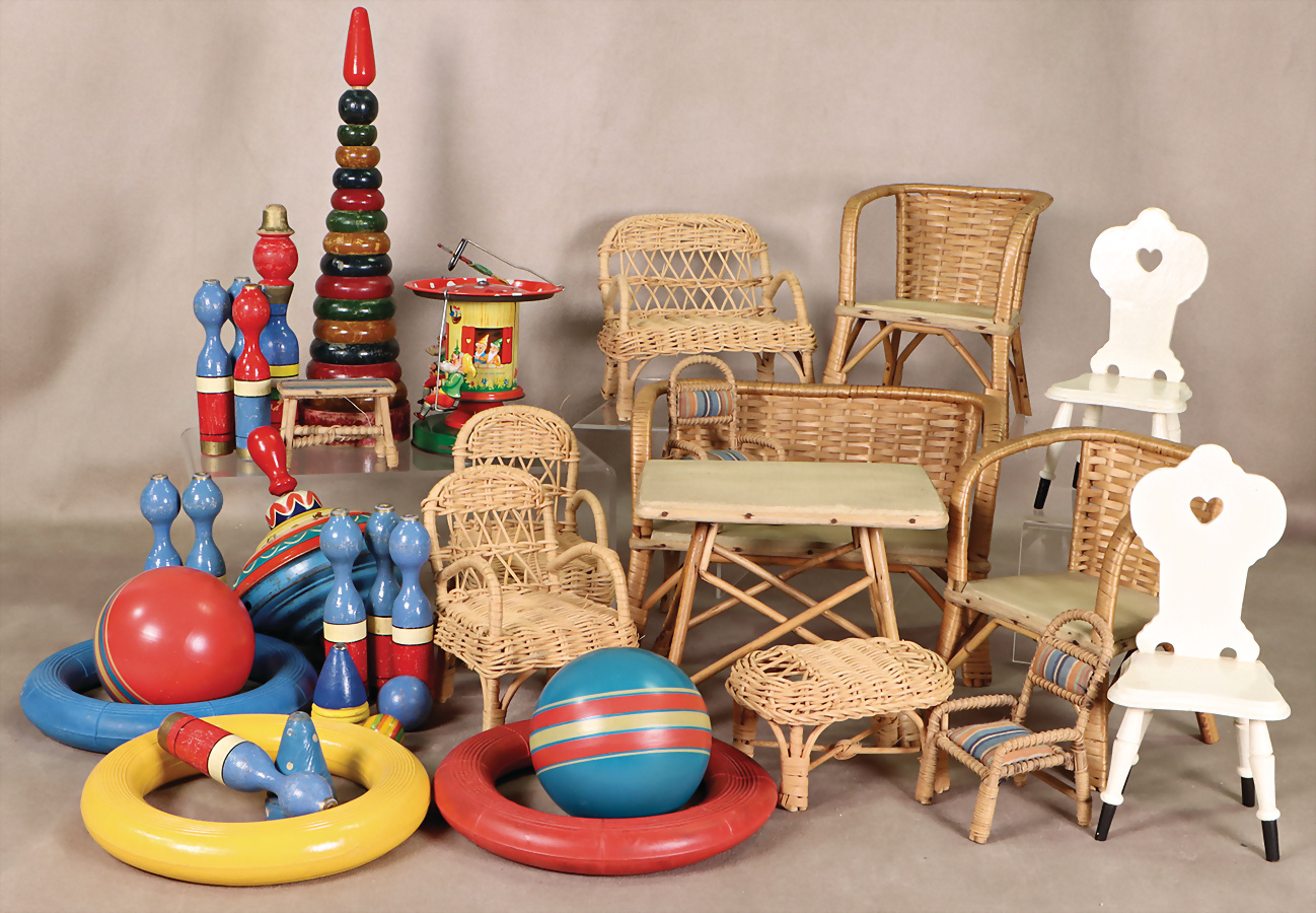 Klappstühle, Tisch, Bank, Sitzbank, 24 cm breit, einige Puppen-Dekorationsteile, Kreisel, kleines Zwergen-Karussell