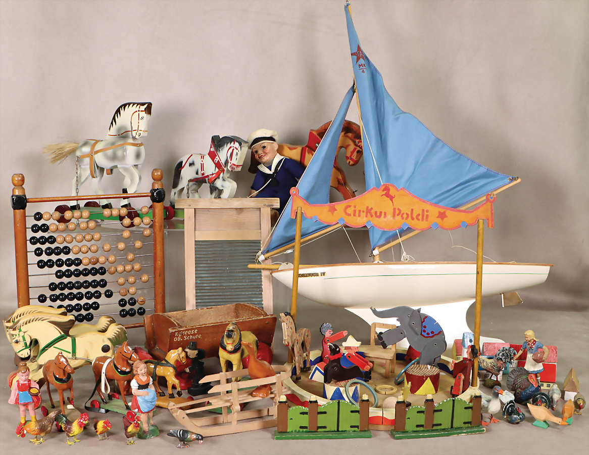 Schönes Konvolut Holzspielzeug (Puppendekoration) Wagen, Pferde, kleinere und mittlere Größen, kleine Zirkusmanege D: 30 cm mit Figuren dekorativ