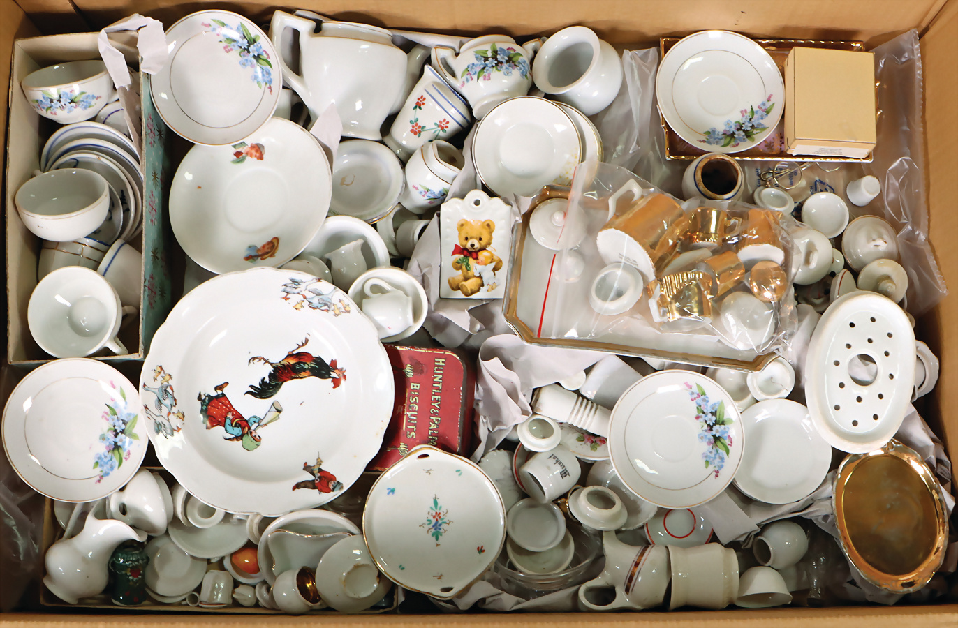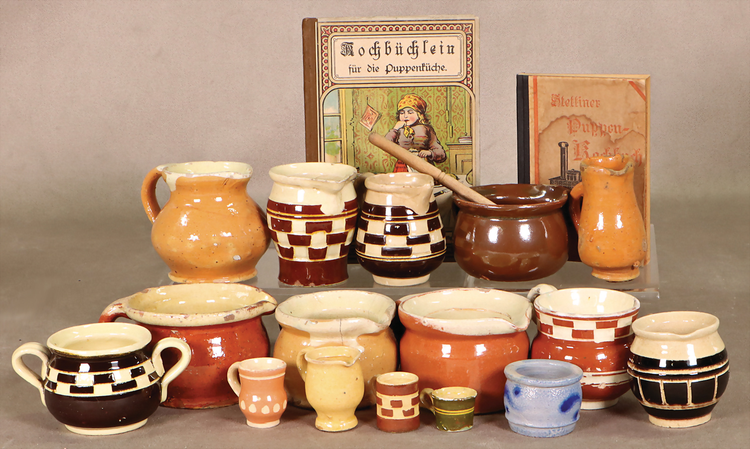 Puppenküchenteile, Keramik, unterschiedliche Größen, 2 Puppenküchen-Kochbücher