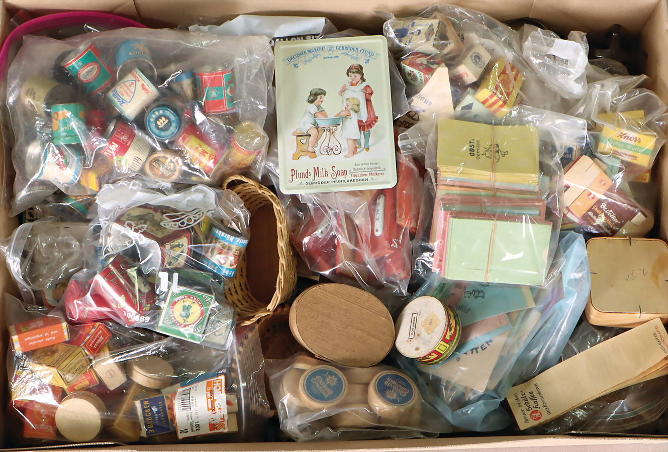 Gr. Konv. Kaufladendosen, Schachteln unterschiedliche Zeit, einige Schubladen mit Porzellanschildern, reichhaltig bitte besichtigen