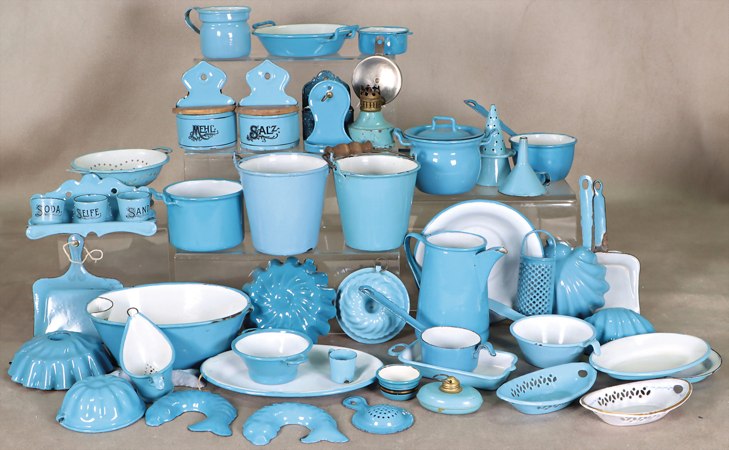 Gr. Konv., Puppenküchenteile, blau/weiß emailliert, Seife, Sand u. Soda, Salz- u. Mehl-Metze, Formen, Teller, Schüsseln, Eimer meist guter Zustand