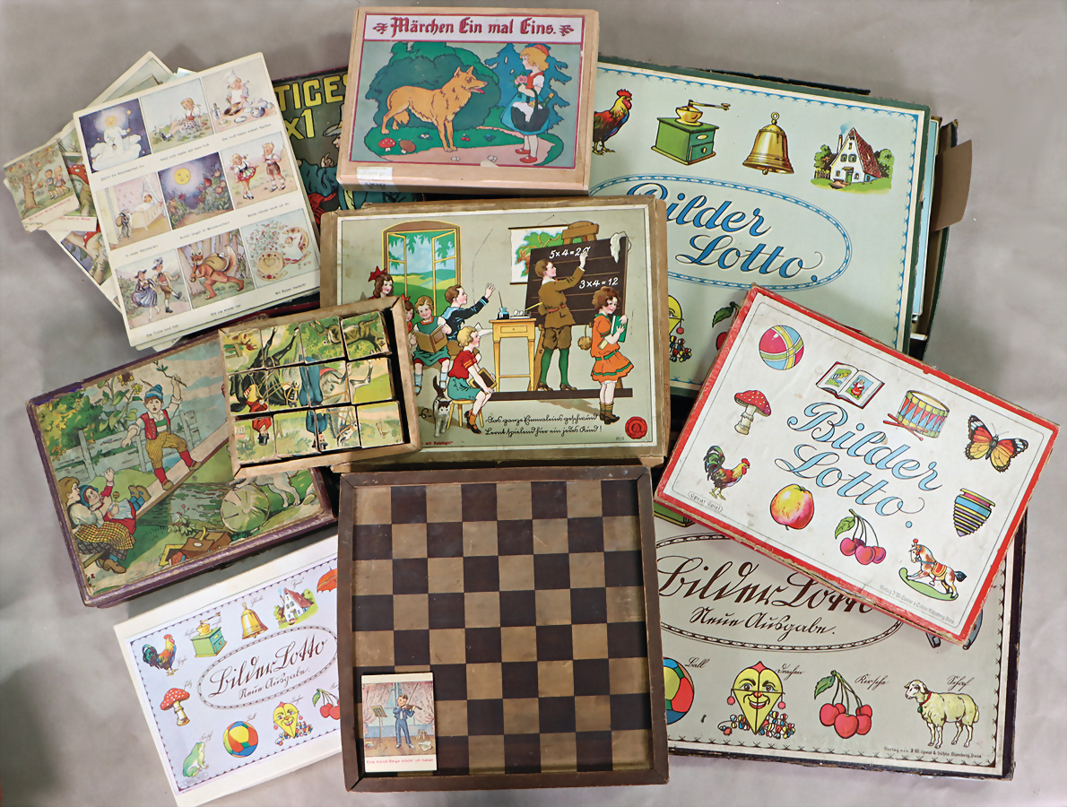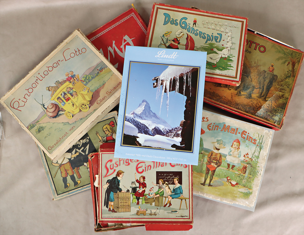 Konv. Spiele, Kinderlieder, Lotto, Tierlotto, Lustiges Einmaleins, im Karton, teilweise verschlissen, 1 Spiel ohne Karton, auf Vollständigkeit nicht geprüft