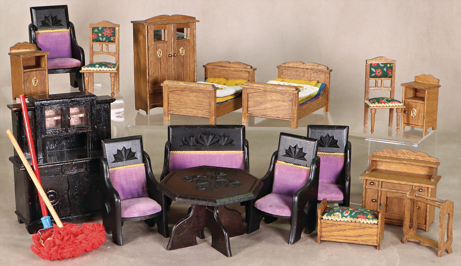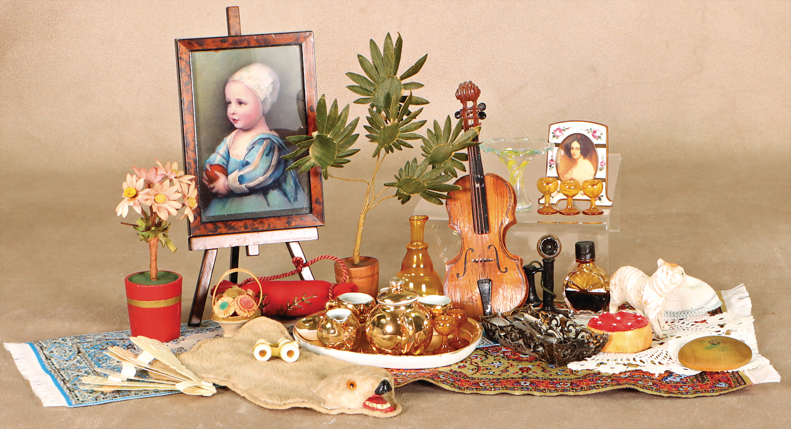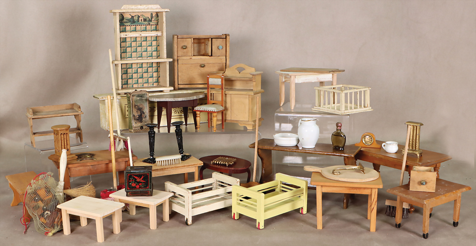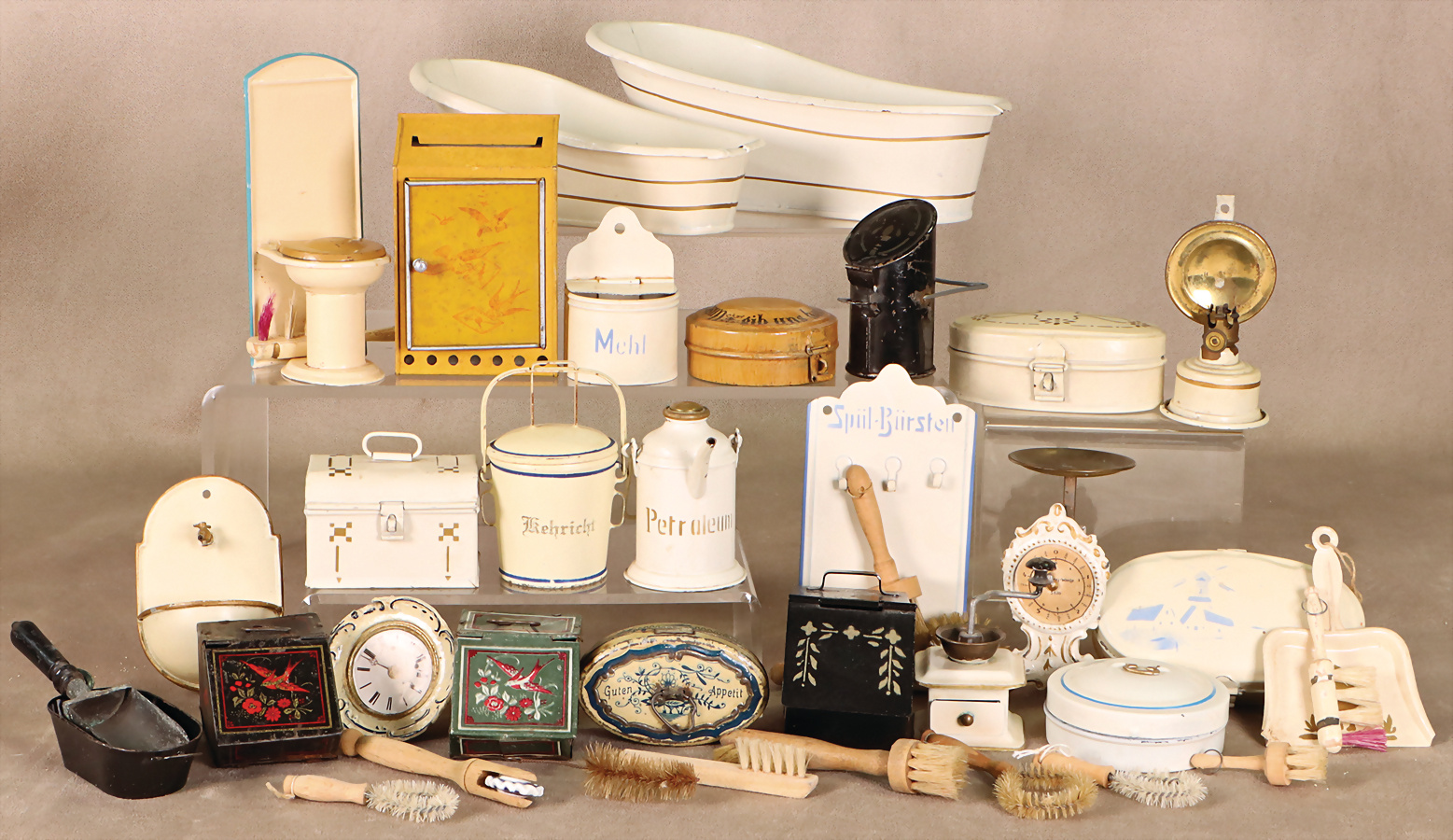 Schönes Konv. Puppenküchenteile, Brotdose Unser täglich Brot gib uns heute, D: 5,5 cm, Kehricht Eimer, Uhr, Tellerwaage, Leuchter, Spülbürstenhalter, Petroleumkanne schönes Konvolut meist guter Zustand