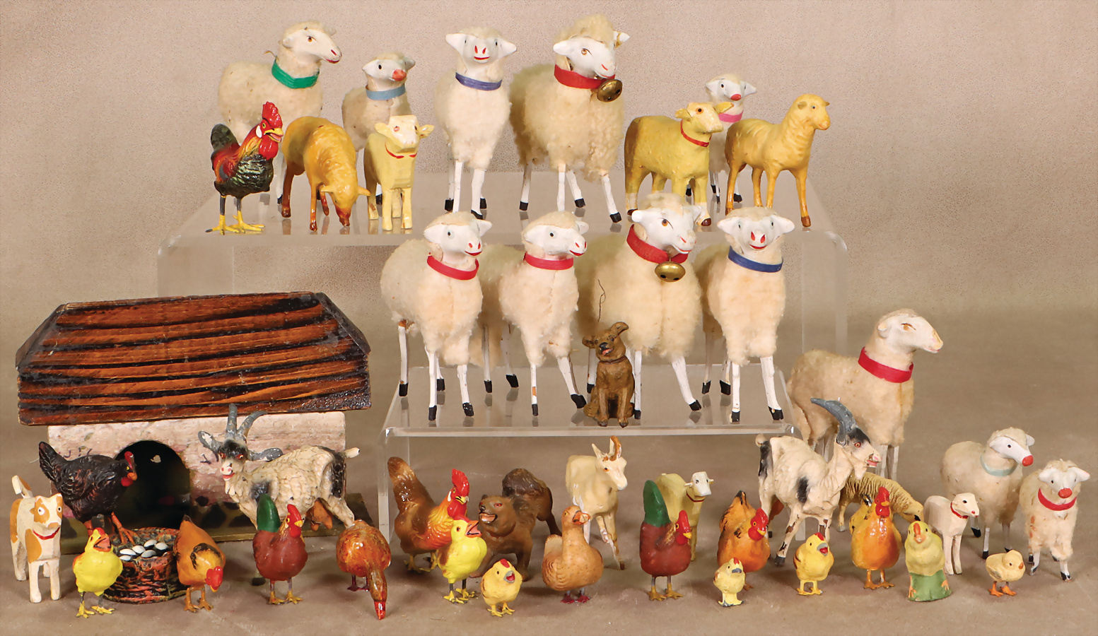 Konv. ELASTOLIN, Masse, Bauernhoffiguren darunter Huhn mit Eierkorb, Federvieh, 2 Hunde, einige Teile ERZGEBIRGE, Reifentiere, einige Wollschafe, meist guter Zustand