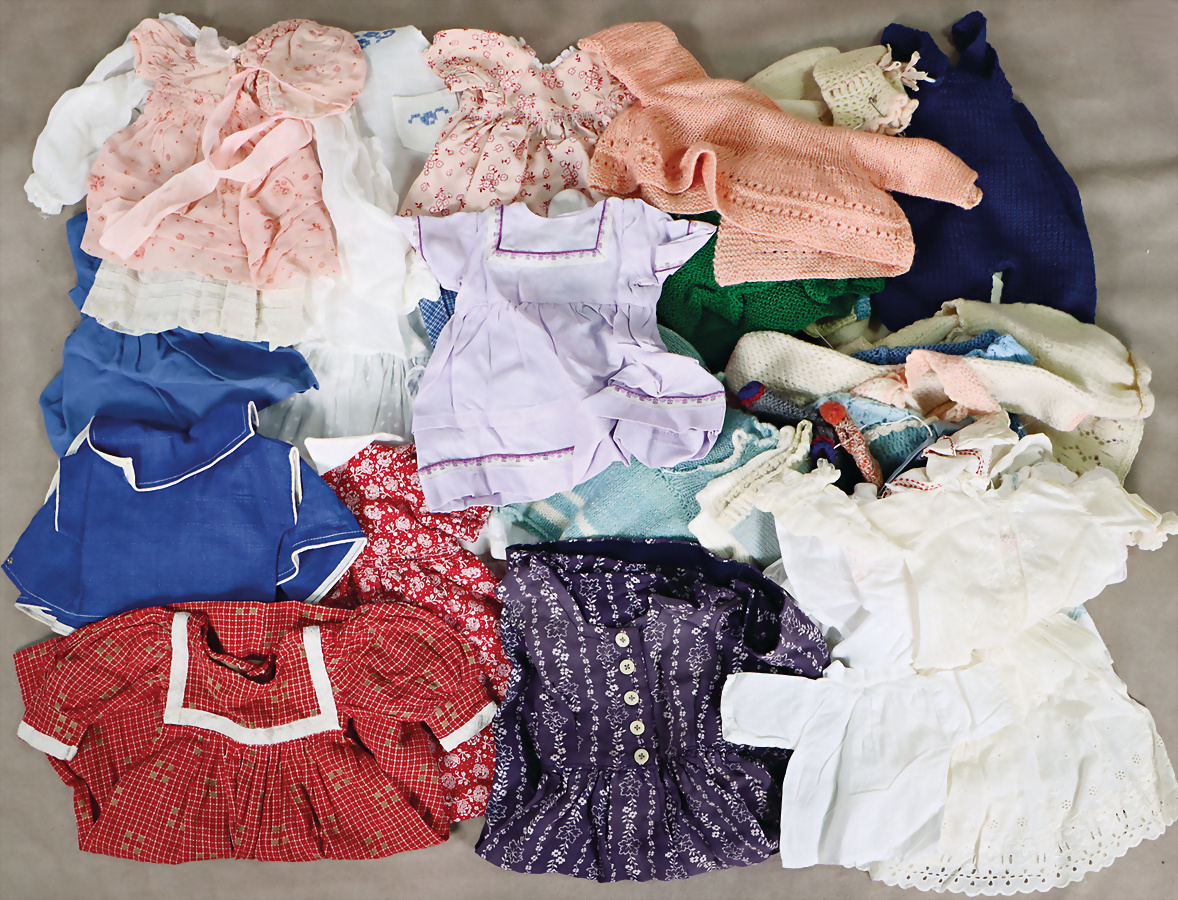 Konv. Puppenkleidung, unterschiedliche Zeit 1910 - 1950, Kleider, Schuhe, Strickkleidung bitte besichtigen