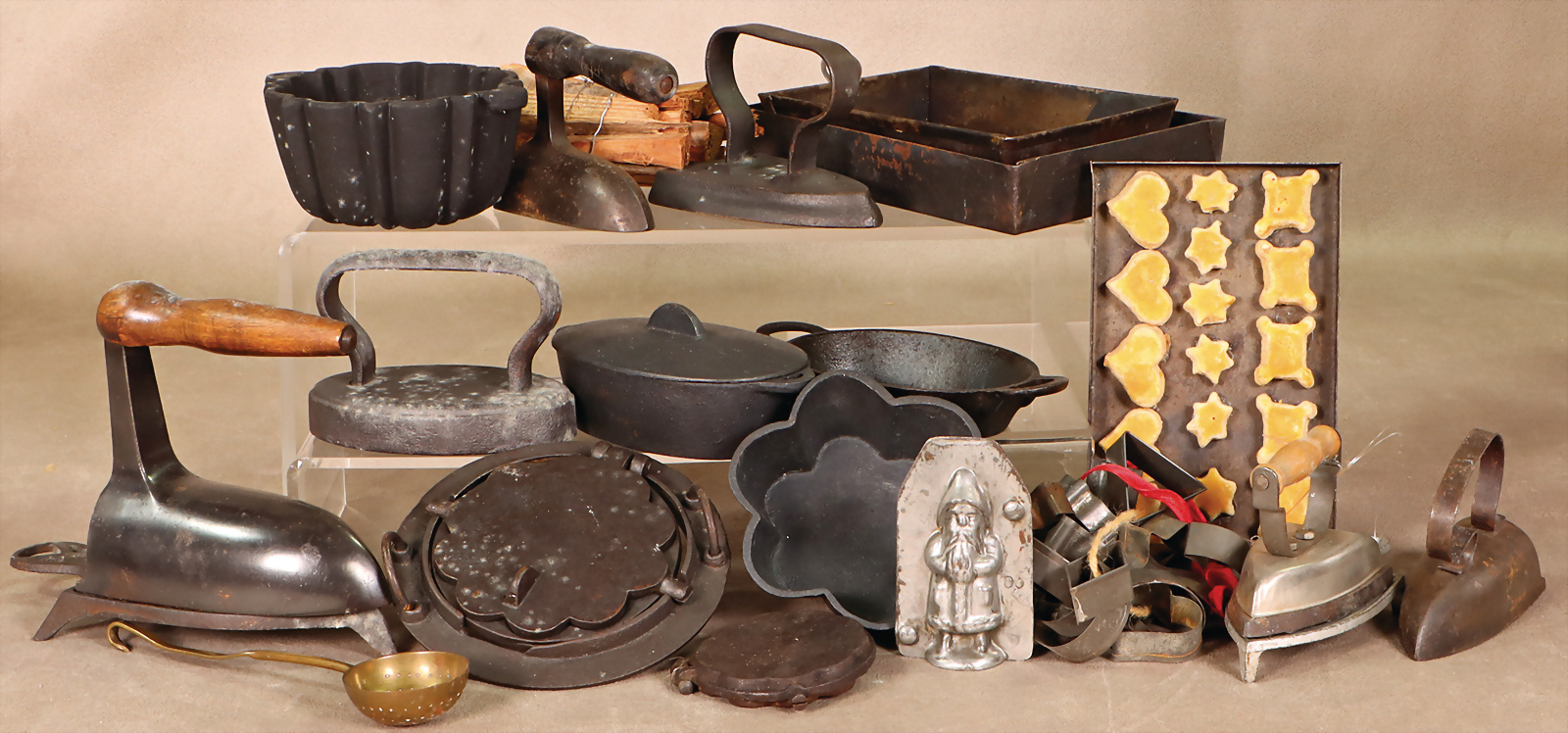 Konvolut Puppenküchen-Teile, Bügeleisen, Pfannen, Guss, Weißblech Backformen, 1 Waffeleisen