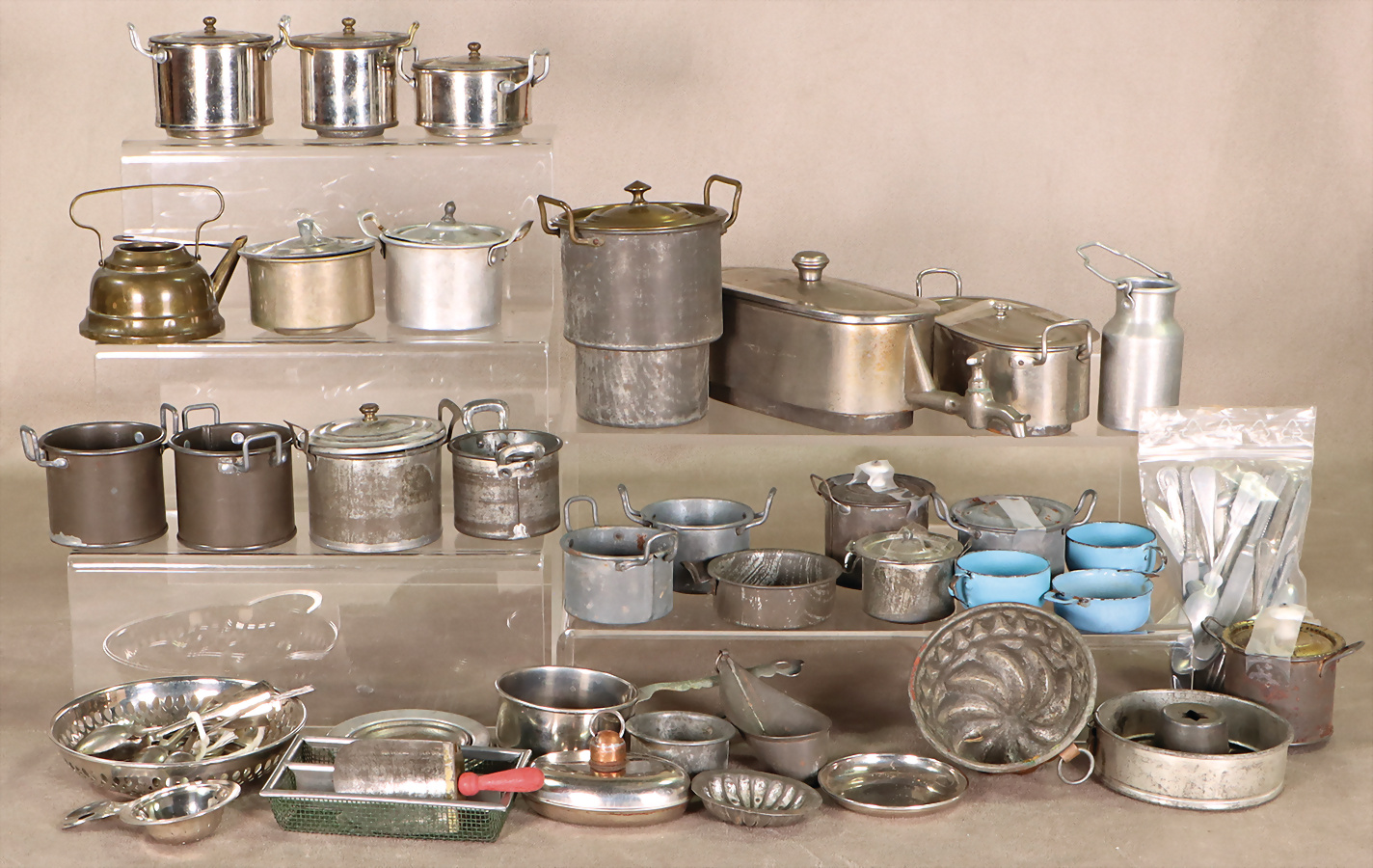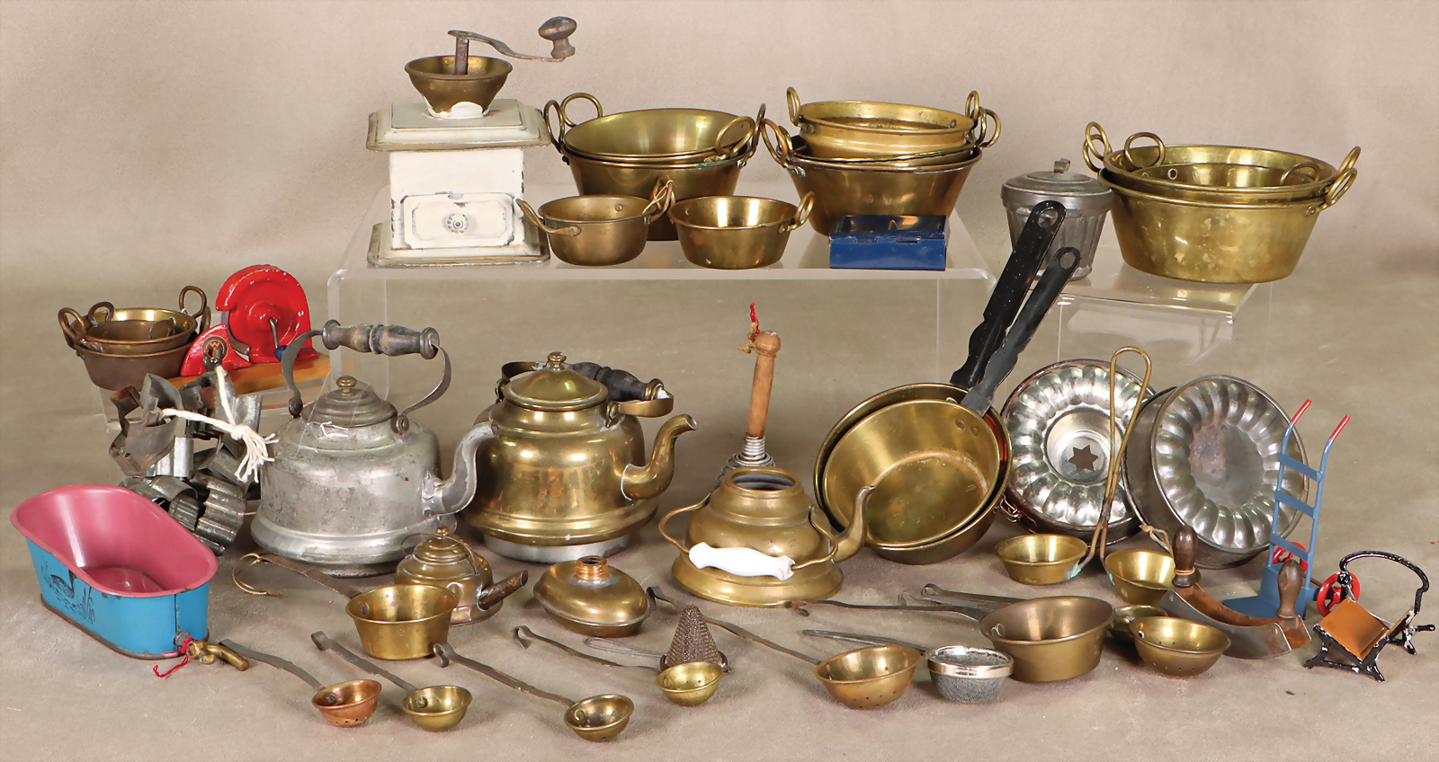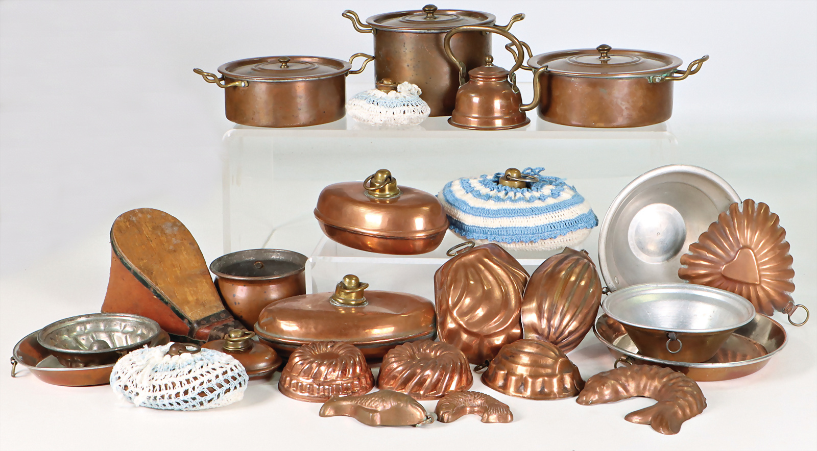 Konv. Puppenküchenteile, meist Kupfer innen verzinnt, Schüsseln, Töpfe, Backformen