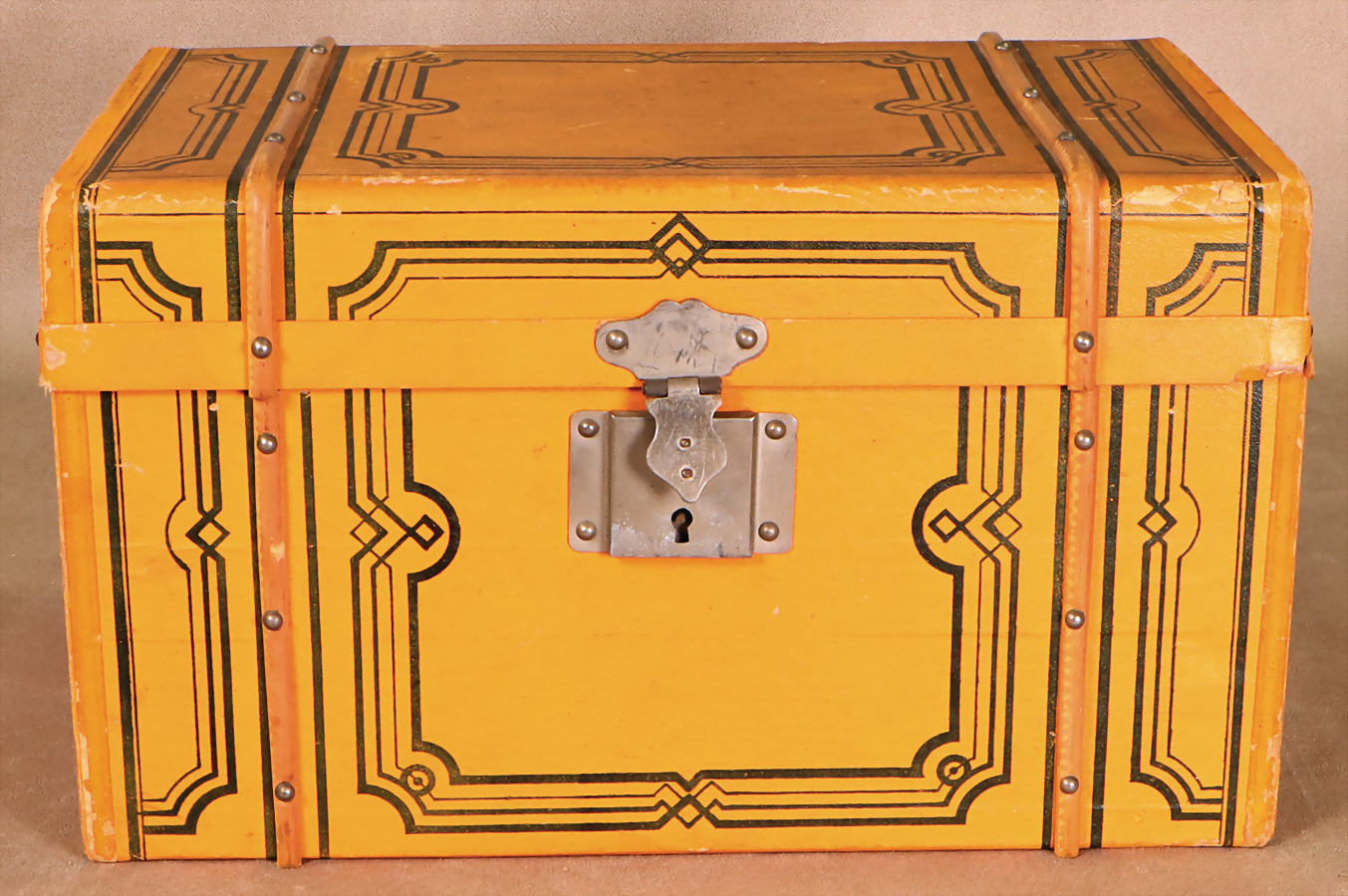 Trousseau-Koffer ohne Einsatz 31,5 cm breit, 2 Perlentaschen, Weißwäsche, 1 Paar Schuhe kleine Größe