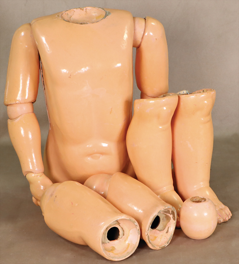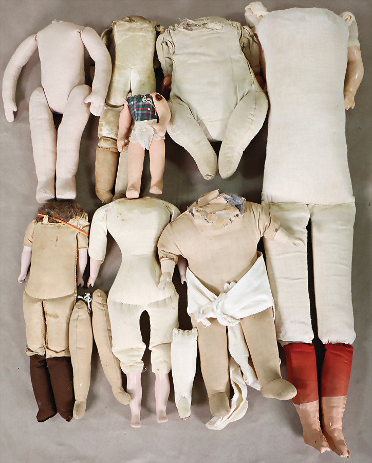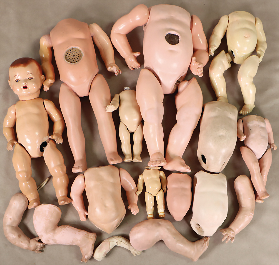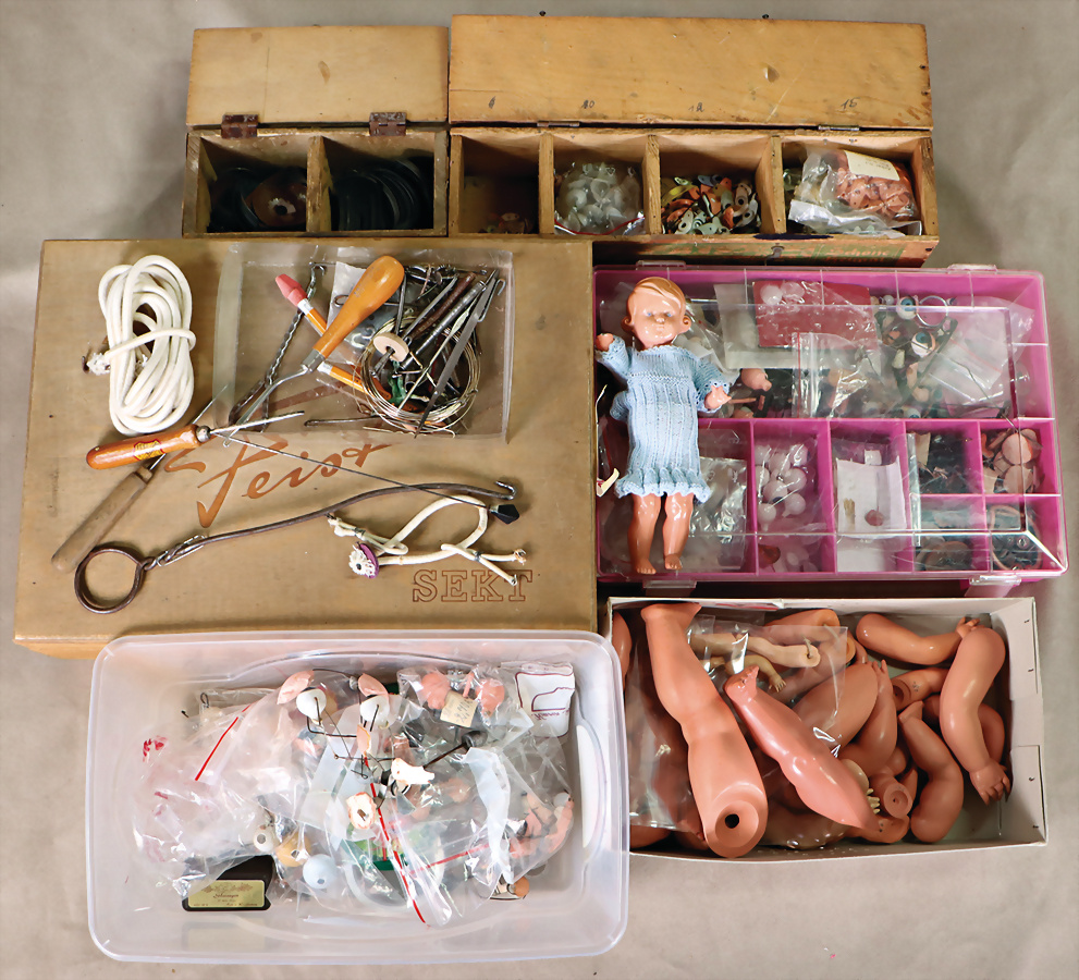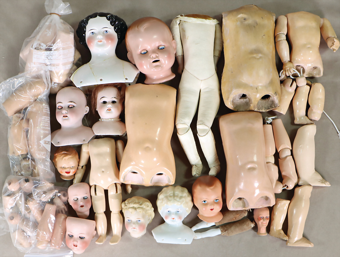 Konv., Puppenkörper und Einzelteile, unterschiedliche Größen, dazu 1 Körper neuer, 1 Lederkörper, Porzellan-Unterarme, mehrere Köpfe, teils in unterschiedlicher Qualität u. Zustand, schöne Fundkiste