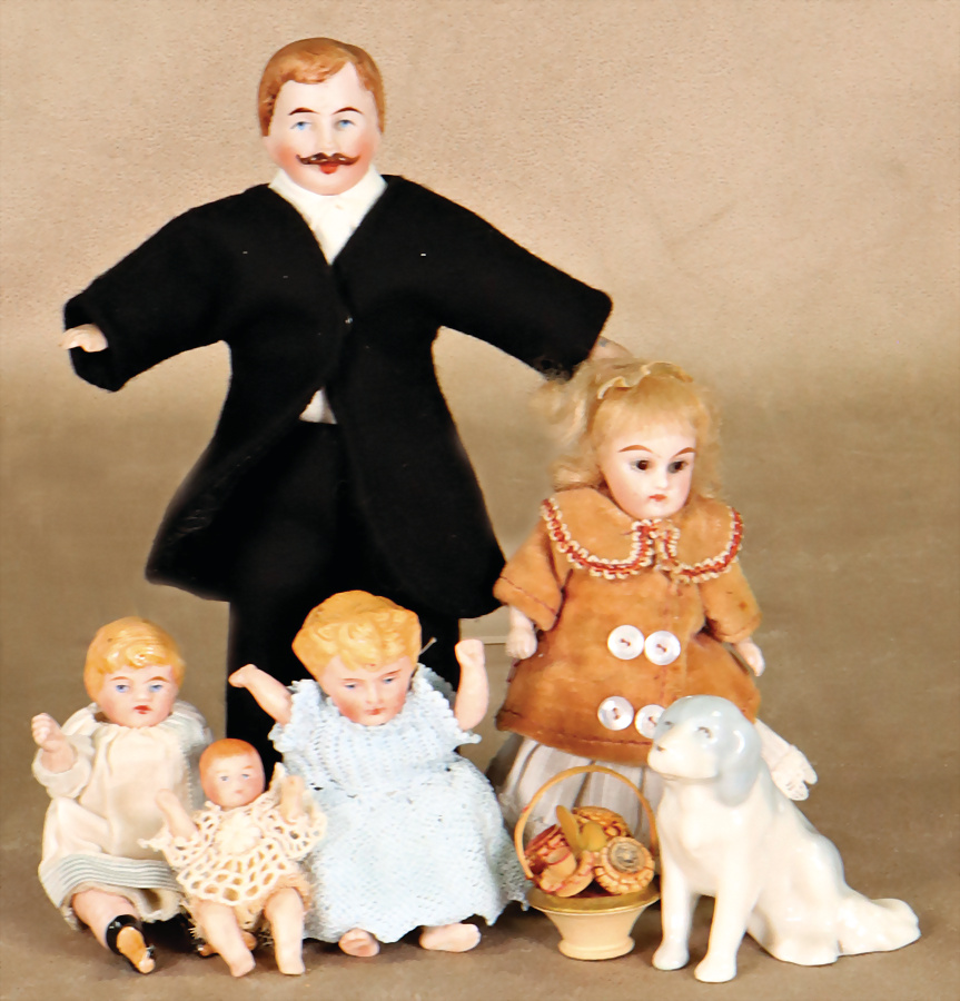 Konv. Puppenstuben-Puppen, Kind Ganzporzellan, 10,5 cm, fester Kopf, bewegliche Arme und Beine, Baby 8,5 cm Ganzporzellan-Baby 8 cm, Ganzporzellan-Mann mit anmodelliertem Schnurrbart, Kleidung neuer, ein Fuß weggebrochen