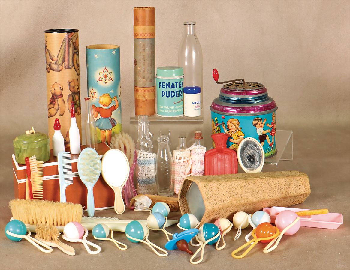 Konv. Puppenausschmückungsteile, einige Kaleidoskope, kleine Rasseln Celluloid Spieldose
