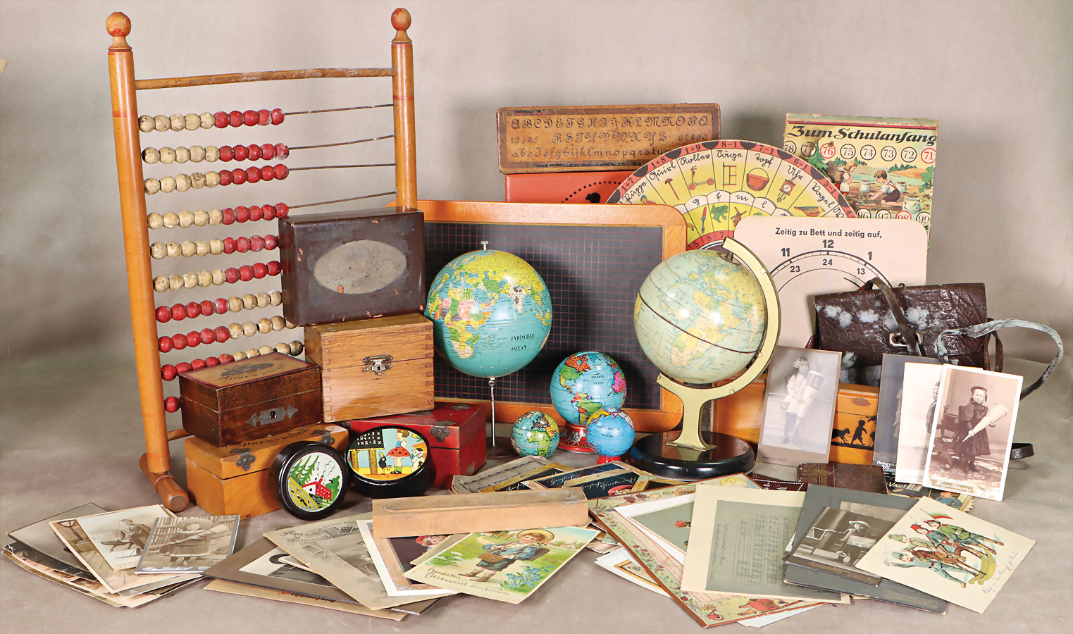 Interessante Fundkiste, Tafel, Stundenplan, kleine Schultüten, Fotos, Tuschkasten, Globen, reichhaltig 1900 – 1930