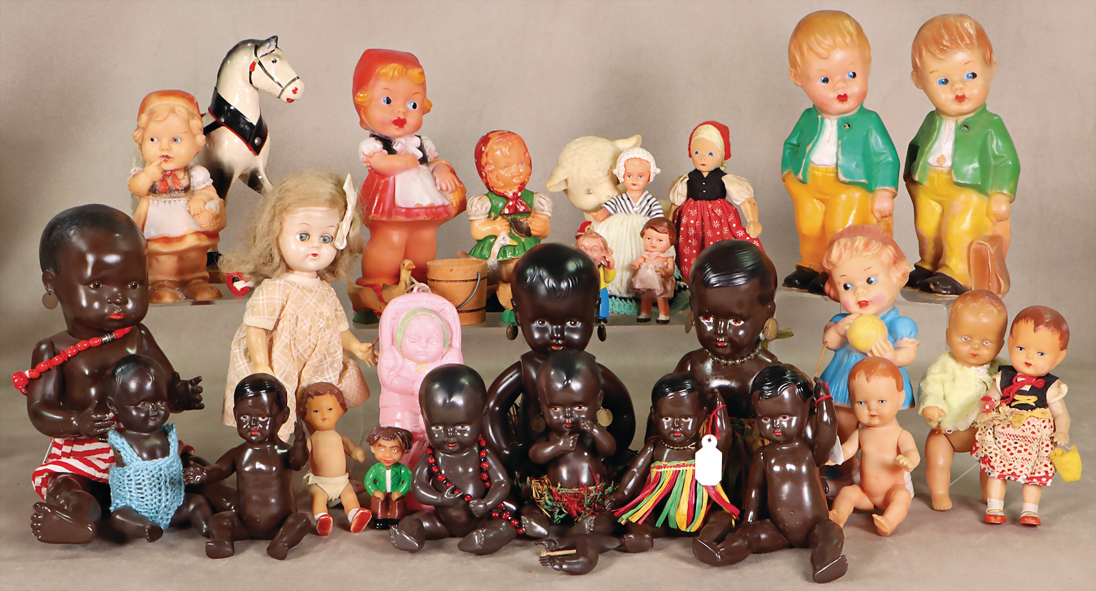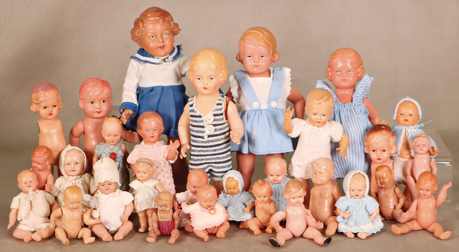 Konv. Celluloid KÖNIG & WERNICKE, 298 Miblu-Kopf, festsitzende Glasaugen, Massekörper, Perücke konnte nicht entfernt werden, KÄMMER & REINHARDT, 1728, 49 cm, Miblu-Kopf, Kopfdeckel unschön fest verklebt, braune Schelmen-Augen, offener Mund, Zähne, Masse, 2 Finger fehlen, SiR, Kurbelkopfpuppe, blaue Schelmenaugen, offener Mund, SiR, Mädchen, 43 cm, Masse-Steh-Körper, Perücken wurden nicht entfernt, Transportrisiko, für Augen Mechanismen beachten, 3 kleinere SCHILDKRÖT Puppen, 1 Puppe STORCH, 1 Puppe MINERVA, Transportrisiko für Celluloid beachten, meist guter Zustand
