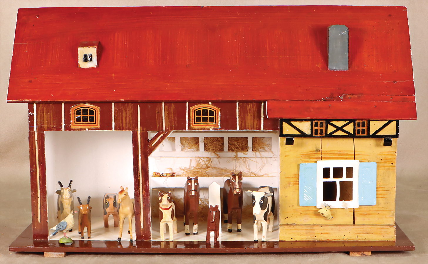 Puppenstuben-Bauernhof, B: 47,5 cm, 27 cm hoch, Bemalung später, ERZGEBIRGE Tiere, Zubehör