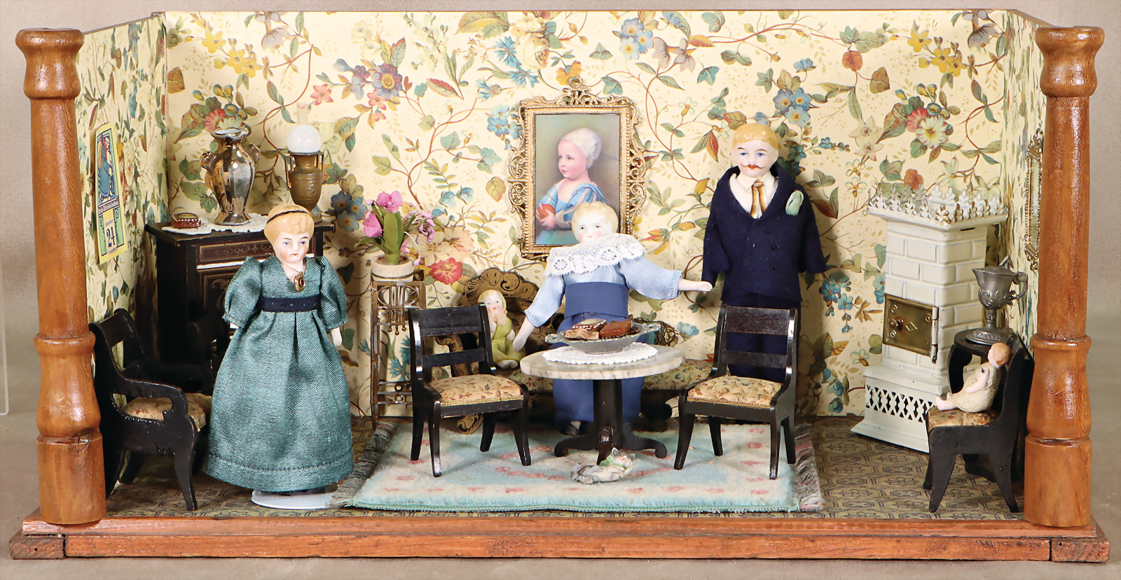 1-tlg. Puppenstube, 46 c, breit, 22 cm hoch, wohl um 1900, Tapete später, eingerichtet mit Biedermeiermöbeln, kleiner Tisch, Ofen, Stubenpuppen u.