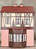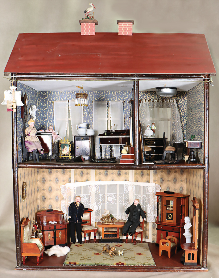 Puppenstubenhaus, 75 cm hoch, 61 cm breit, 35 cm tief, 3 Zimmer, überarbeitet, eingerichtet mit schönen Möbelprogrammen, Biedermeier - Jugendstil