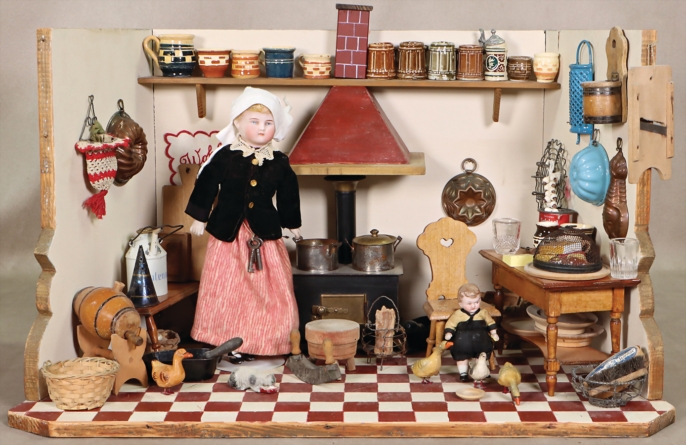 Rauchfangküche, Eigenbau, Alter? 54 cm breit, 35 cm hoch mit Zubehör, Brustblattkopf-Puppe, ausmodellierte Haare