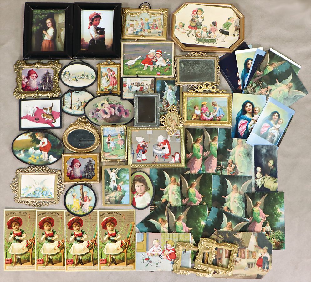 Größeres Konv, Puppenstuben-Bilder oder -Bilderrahmen, einige Spiegel, teils ERHARD & SÖHNE, teils Zinn