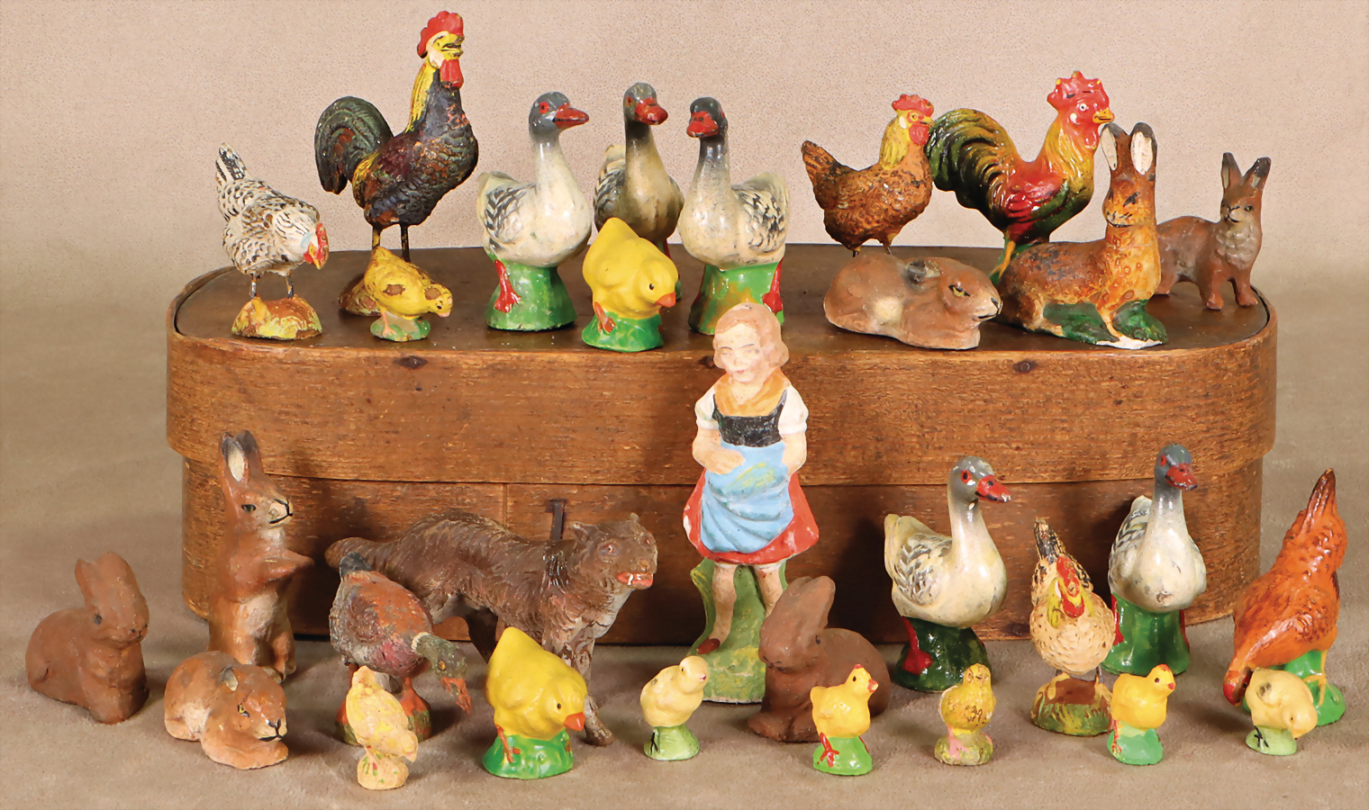 Gr. Konv. Tierfiguren, Presspappe auf Holzsockel montiert, 5 - 10 cm, sehr guter Zustand, umfangreich