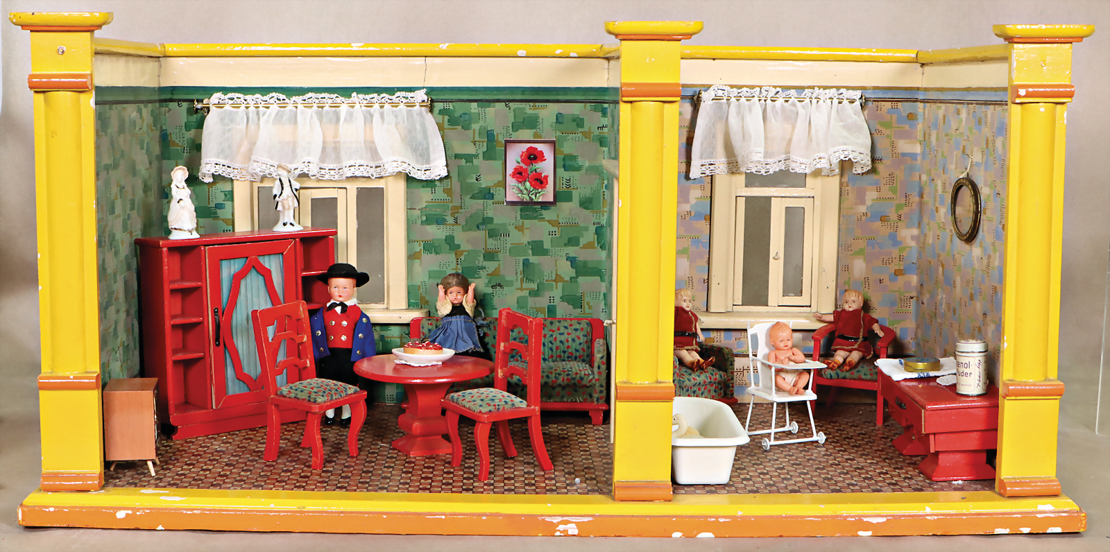 2-tlg. Puppenstube, 74 cm breit, 35,5 cm hoch, 34,5 cm tief, neu bemalt, 2 Fenster, Durchgangstür, aus unterschiedlicher Zeit, mit Puppenstuben-Puppen