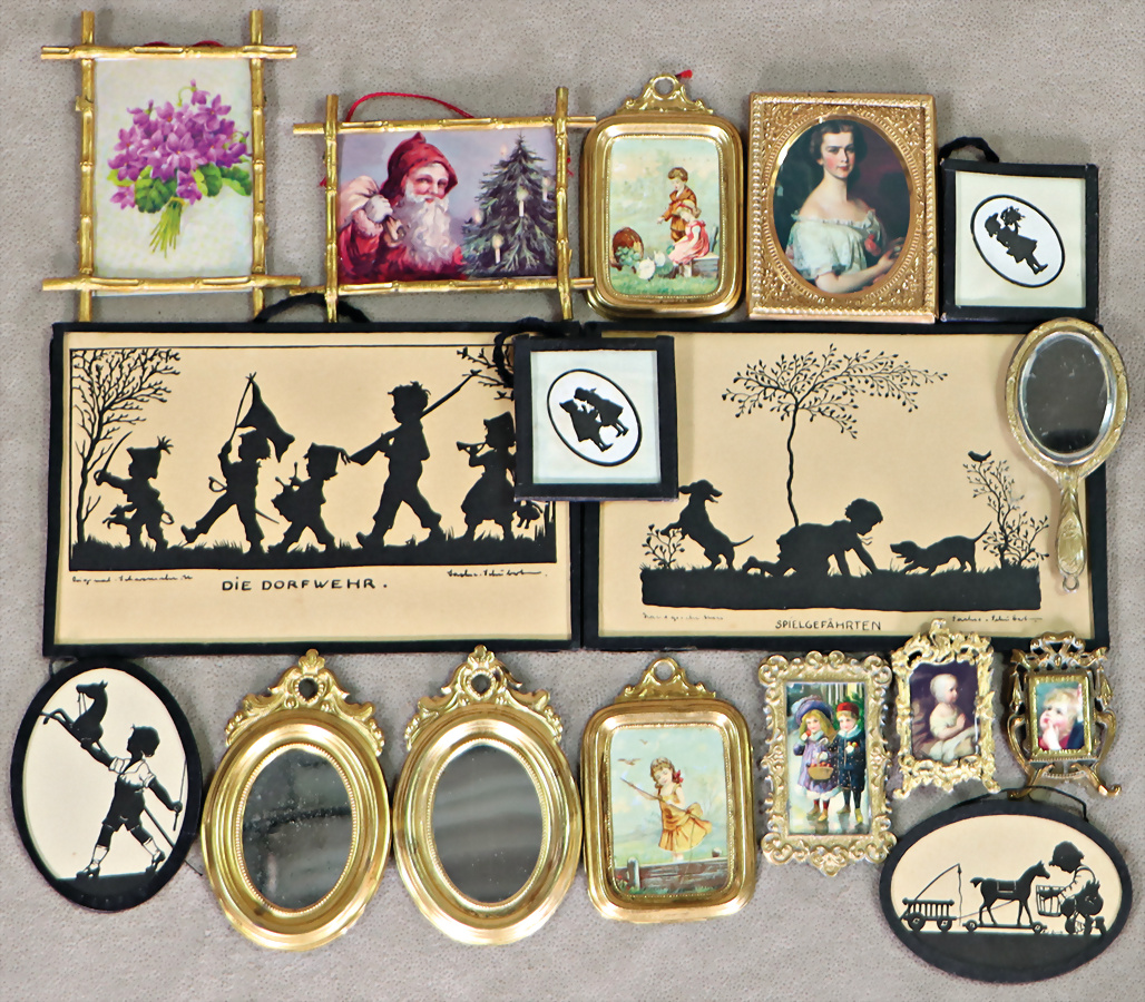 Konv. Puppenstuben-Möbel, Bilder- und Spiegelrahmen, teils Messingblech vergoldet, unterschiedliche Größen, 1 Handspiegel mit geschliffenem Glas, einige Bilder, Scherenschnitt