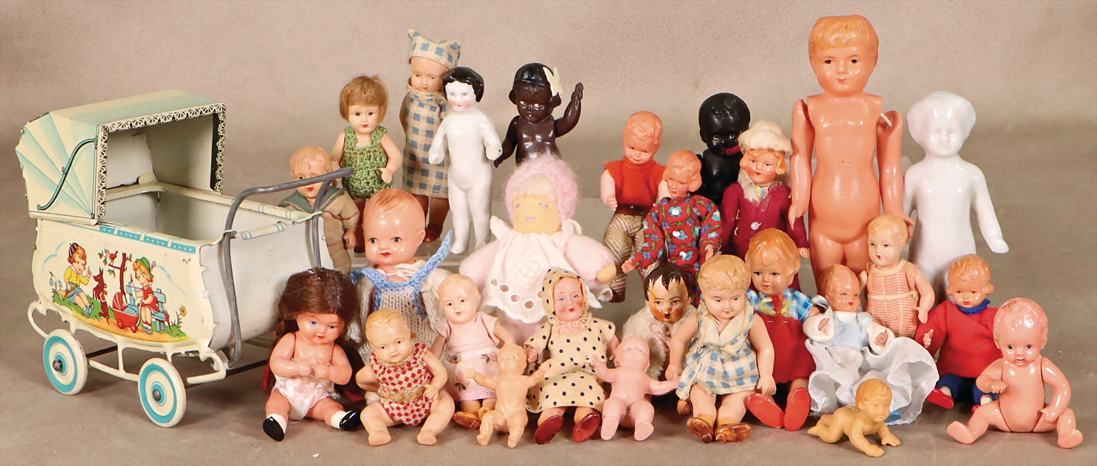 Konv. Puppen, Celluloid, Kunststoff, unterschiedliche Größen, ein Puppenwagen, Blech lithographiert, guter Zustand 15,5 cm