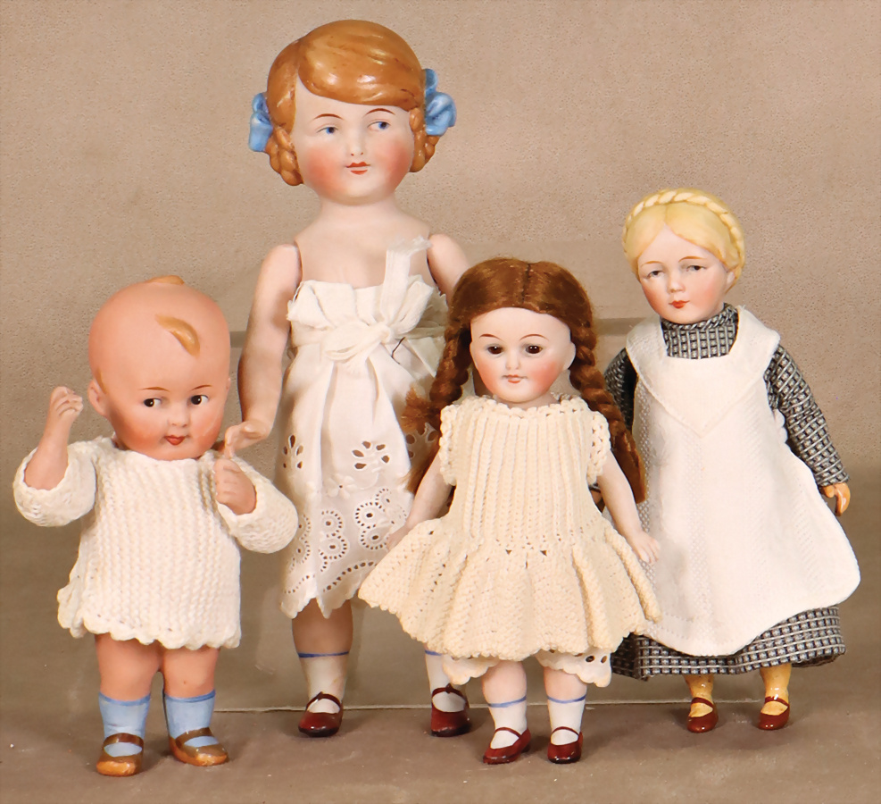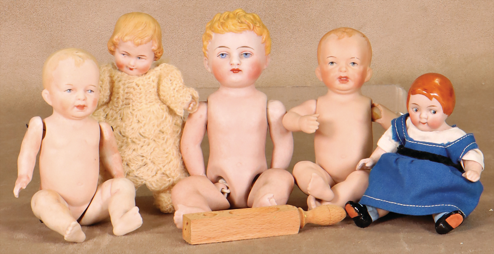 Konv. Ganzbiskuit-Puppen, Googly, 11 cm fester Kopf, seitlich blickende off./geschl. Melonenmund, bewegliche Arme und Beine, 1 Fuß ausgebessert, 3x Baby Ganzporzellan, davon 1x neuer,(Arm beschädigt, eine Puppe Beine ergänzt)