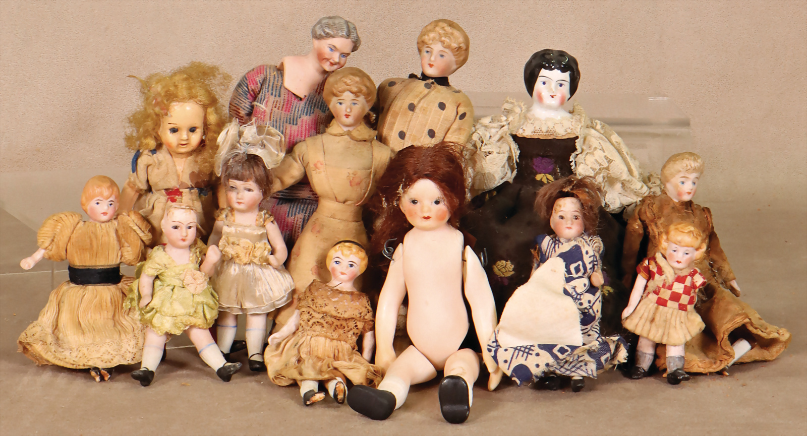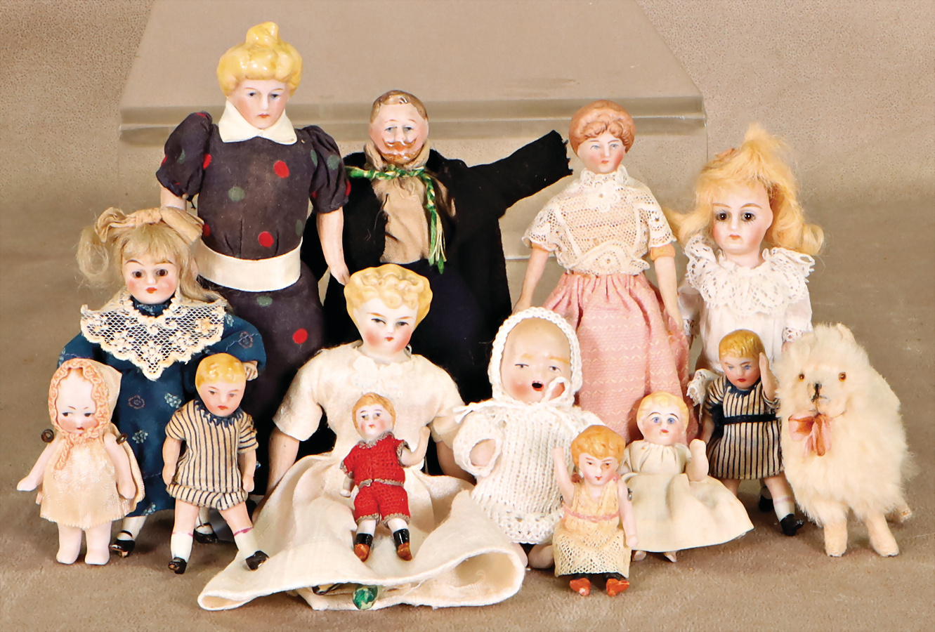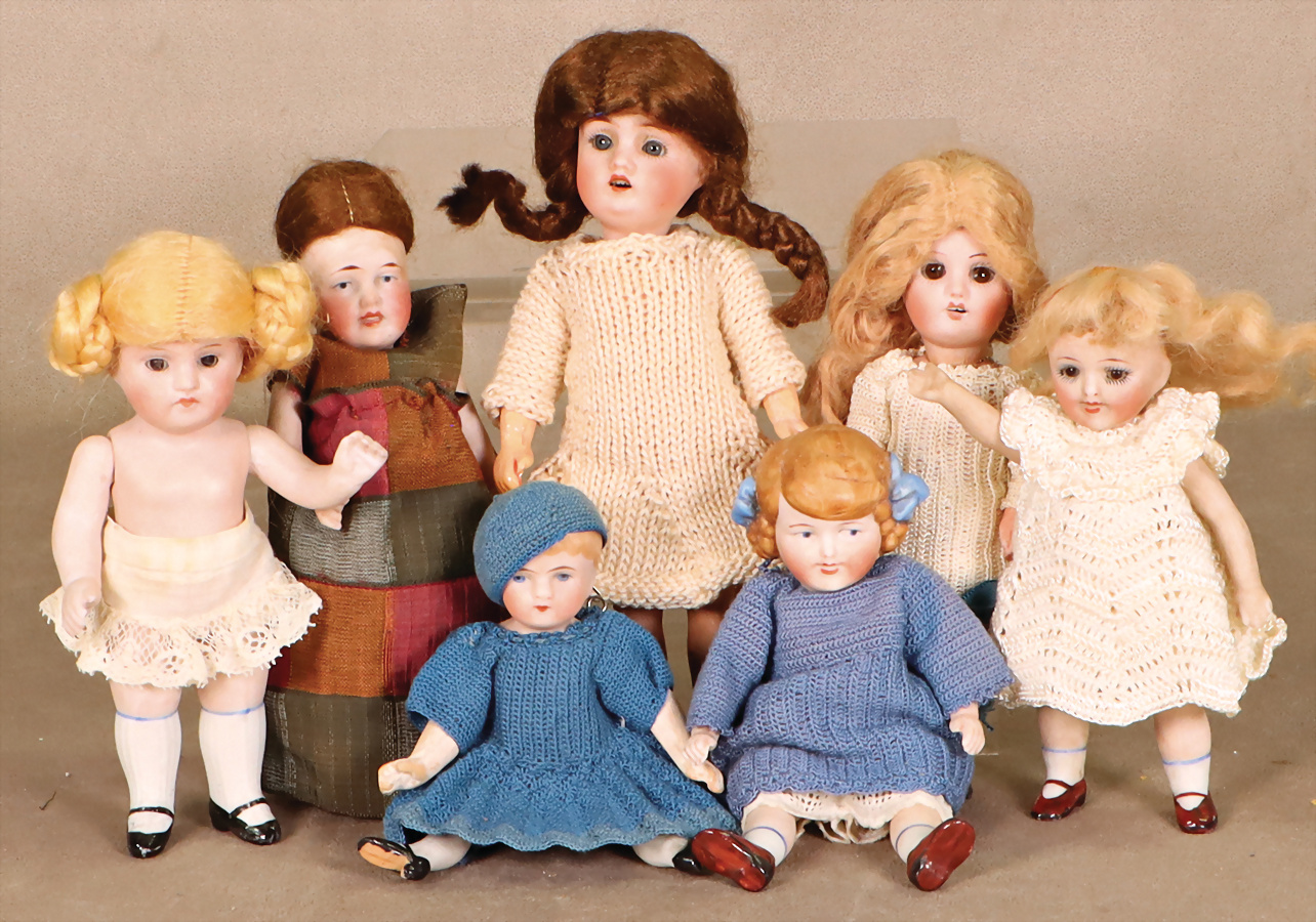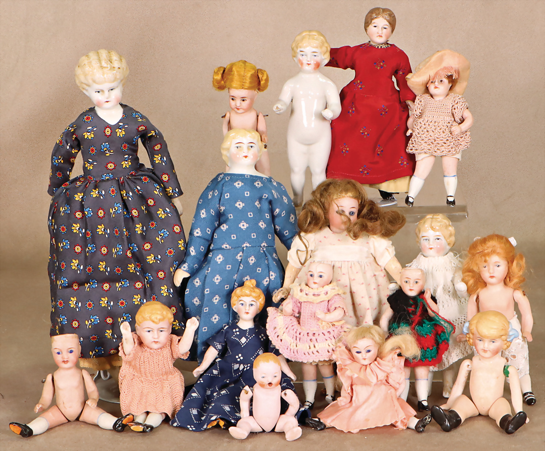 Puppenstuben-Puppen, 7-16 cm, teils Porzellan-Brustblattköpfe, teils Ganzporzellan, teilweise Fehlstellen, teils guter Zust.