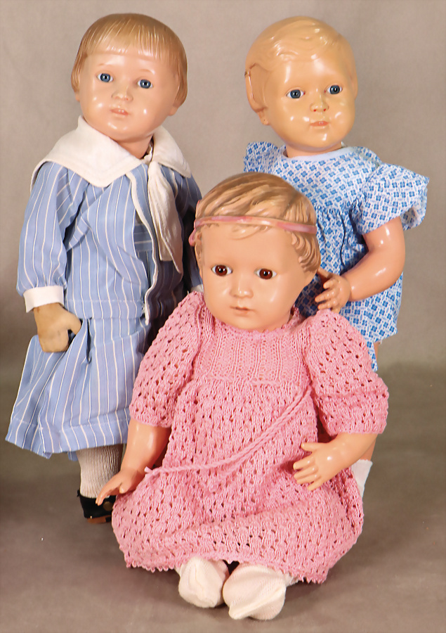 Konv. Celluloid, 3 Teile Mädchen mit Pagen-Schnitt, Glasaugen, 35 cm, Stoffkörper, Mädchen mit Haarspange 30 / 40, blaue Glasaugen, nachträglich durchstochene Ohren, Mädchen mit Haarband, 35 cm, braune Glasaugen, Sitz-Baby-Körper