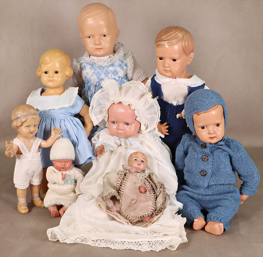Konv. Baby-Puppen Celluloid, dazu Mädchen mit Haarband, fester Kopf, bewegliche Arme und Beine, anmodellierte Schuhe, 1x Mädchen Glasaugen, fester Kopf, Abweichung an den Armen, bitte Transportrisiko für Celluloid beachten