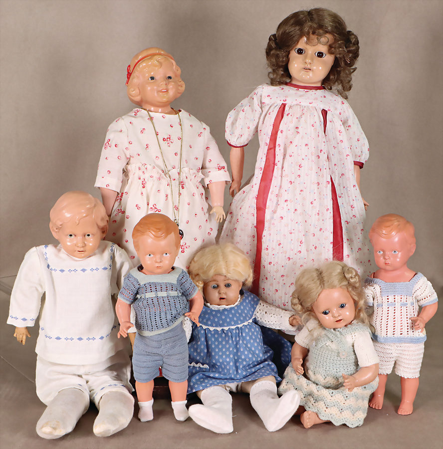 Konv. SCHILDKRÖT u.a., Celluloid, Hans 25½, cm 1 Arm weggebrochen, 1x 25½ cm, 2 Finger fehlen, 3x Brustblatt kopfpuppen, 1 Puppe Stoffkörper, 1 Puppe-Sitz-Babykörper, BRUNO SCHMIDT, meist guter Zustand, Transportrisiko für Celluloid beachten