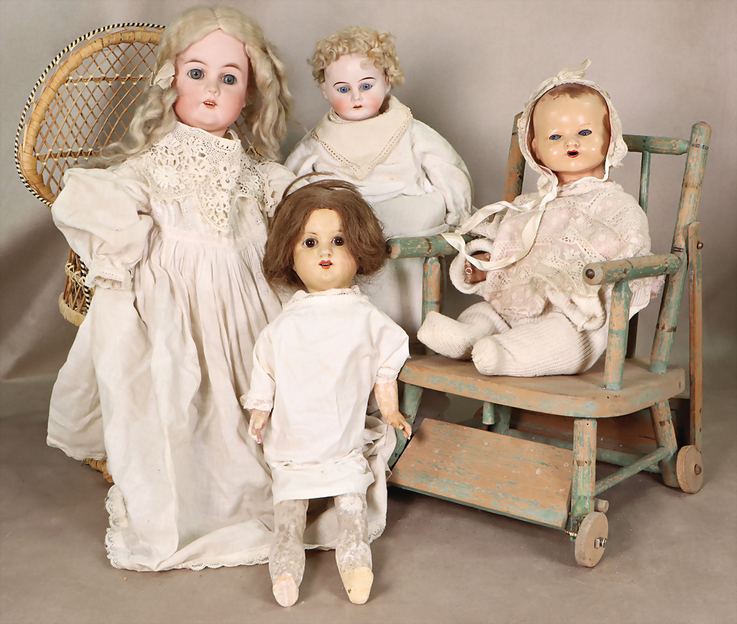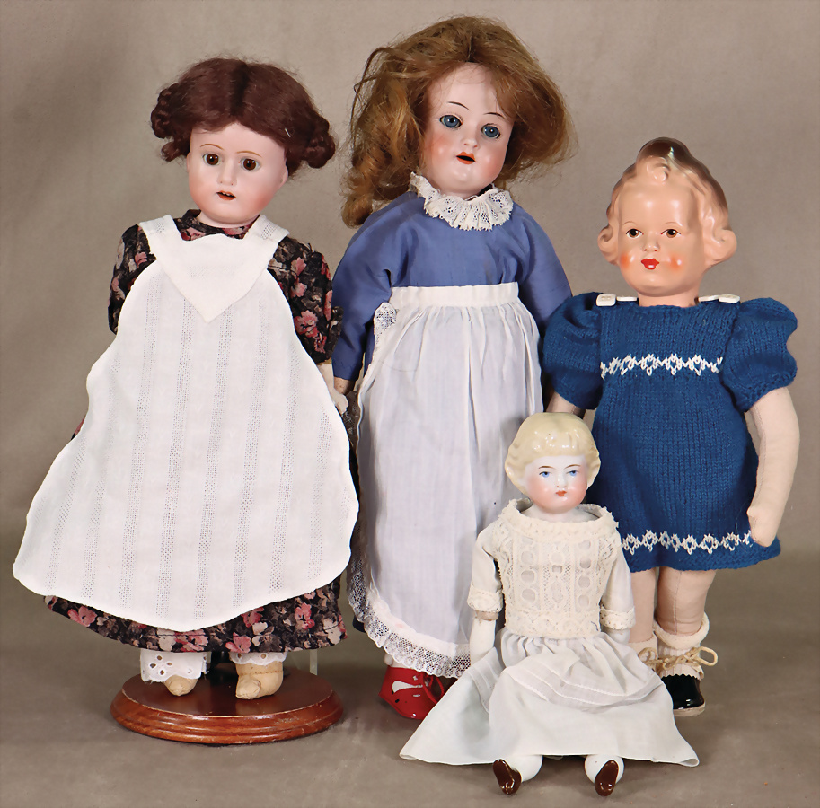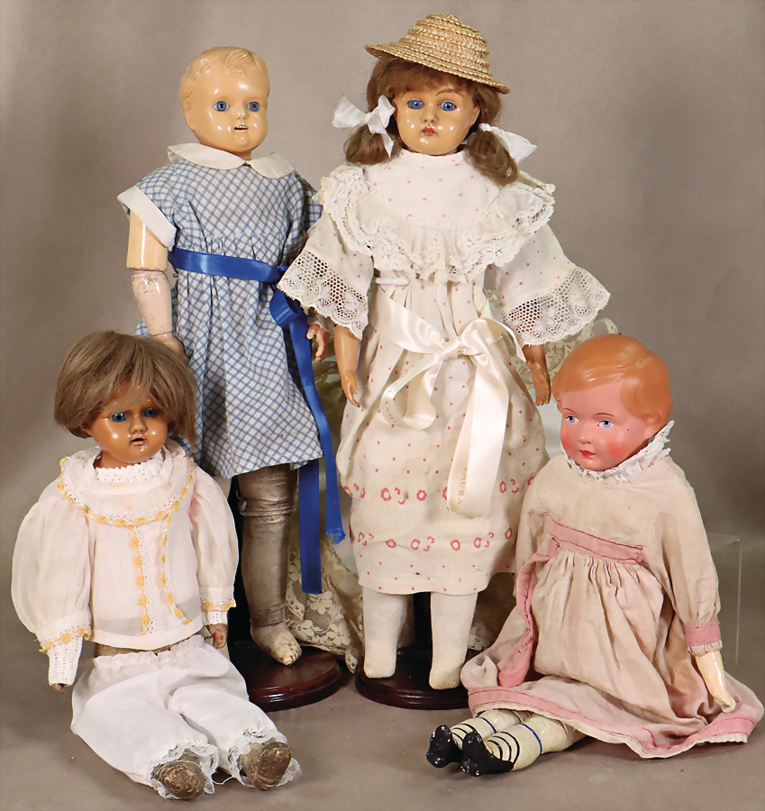 Konv. 4 Teile, Puppen, Celluloid, Brustblattköpfe, Leder- u. Stoffkörper, 1x Glasaugen, 1x gemalte Augen, darunter 1 Puppe, SiR, Kopf beschädigt, 1 Puppe gem. F, stark ausmodellierte Haare, bespielter Zust., bitte Transportrisiko für Celluloid beachten