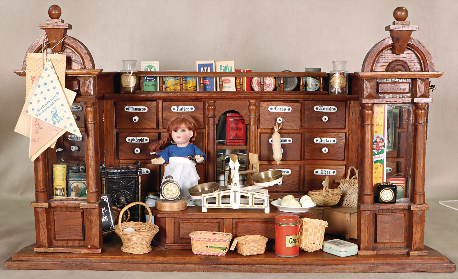 Gründerzeit Kaufladen, H: 64 cm, B 39 cm, Schubladen mit Porzellanschildern, Orig.-Theke, reichhaltigst Zubehör, mit Puppe