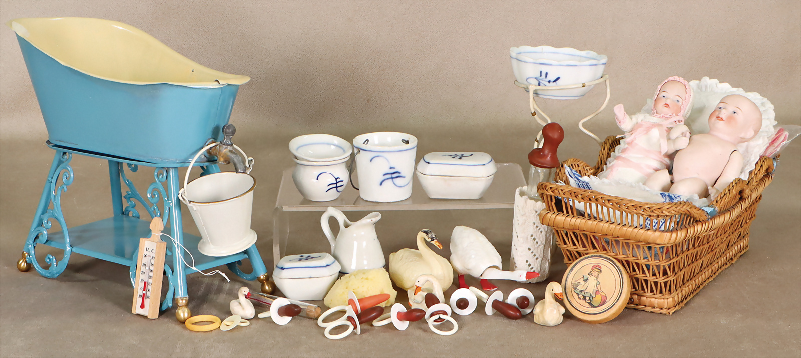 Puppenstuben-Badewanne, farblich überarbeitet, kleiner Hans, Porzellan-Puppe, Gummis locker, Kleinteile